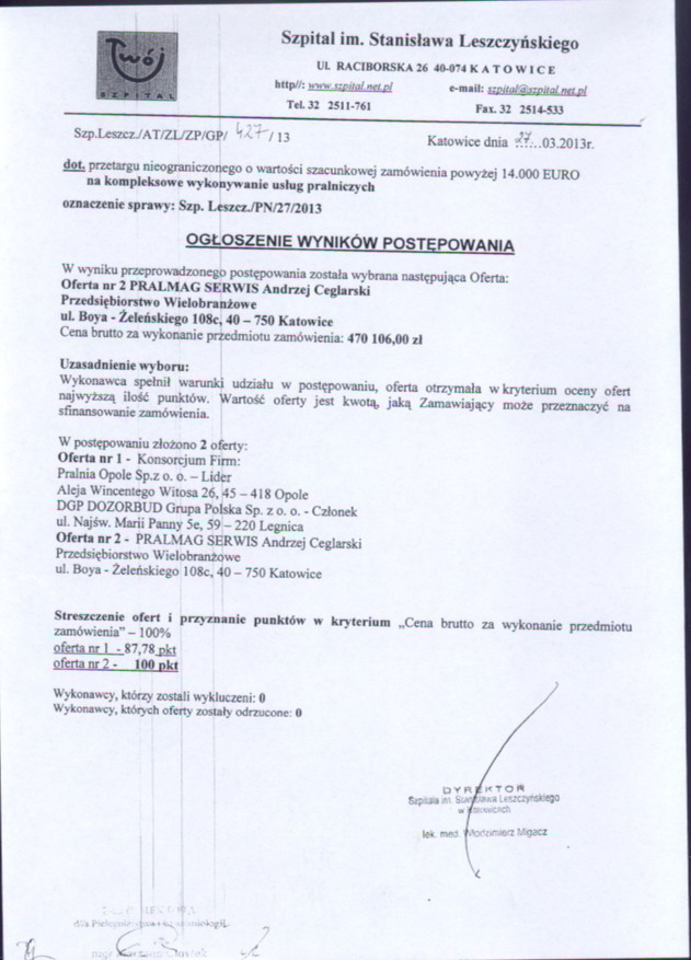 Otwarcie ofert nastąpi w dniu 22.03.2013r. o godz. 11:00 w Sekcji Zamówień Publicznych w Katowicach przy ul. Raciborskiej 28 (budynek Przychodni Szpitala, II piętro).