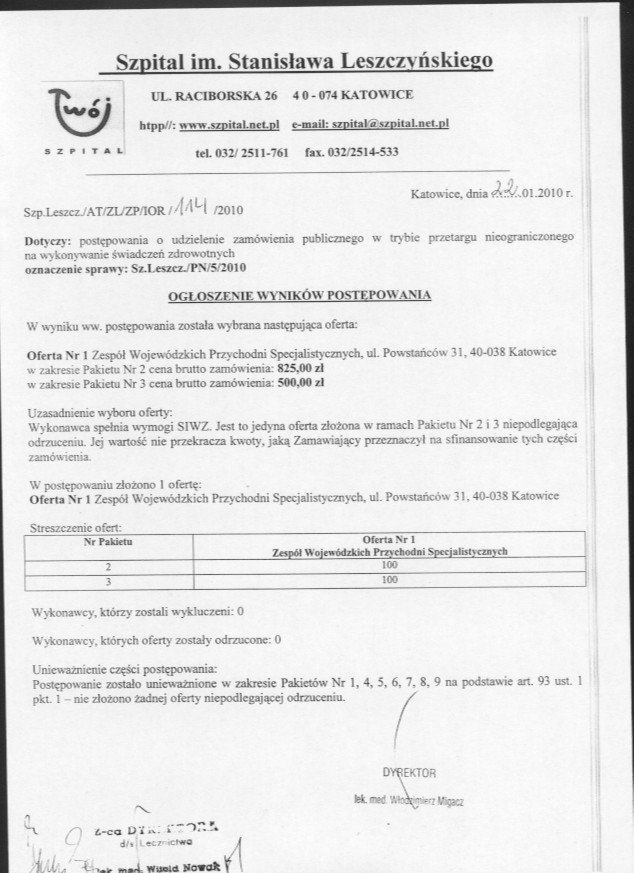 Oferty należy złożyć do dnia 18.01.2010r. do godz. 10:00 w Kancelarii Dyrektora Szpitala w Katowicach przy ul. Raciborskiej 26.
