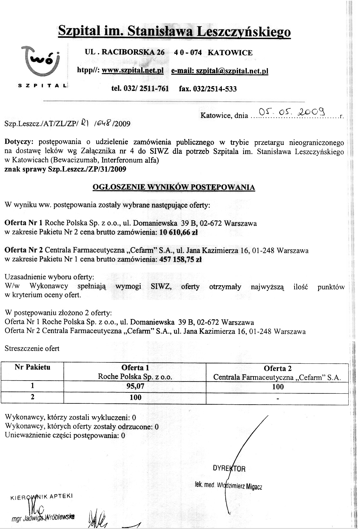 do dnia 29.04.2009r. do godz. 10:00 w Kancelarii Dyrektora Szpitala w Katowicach, przy ul. Raciborskiej 26.