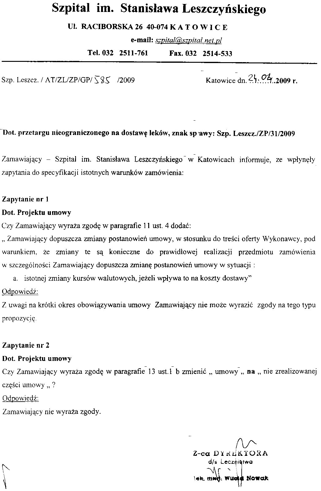 Załącznika nr 4 do SIWZ dla potrzeb Szpitala im. Stanisława Leszczyńskiego w Katowicach.