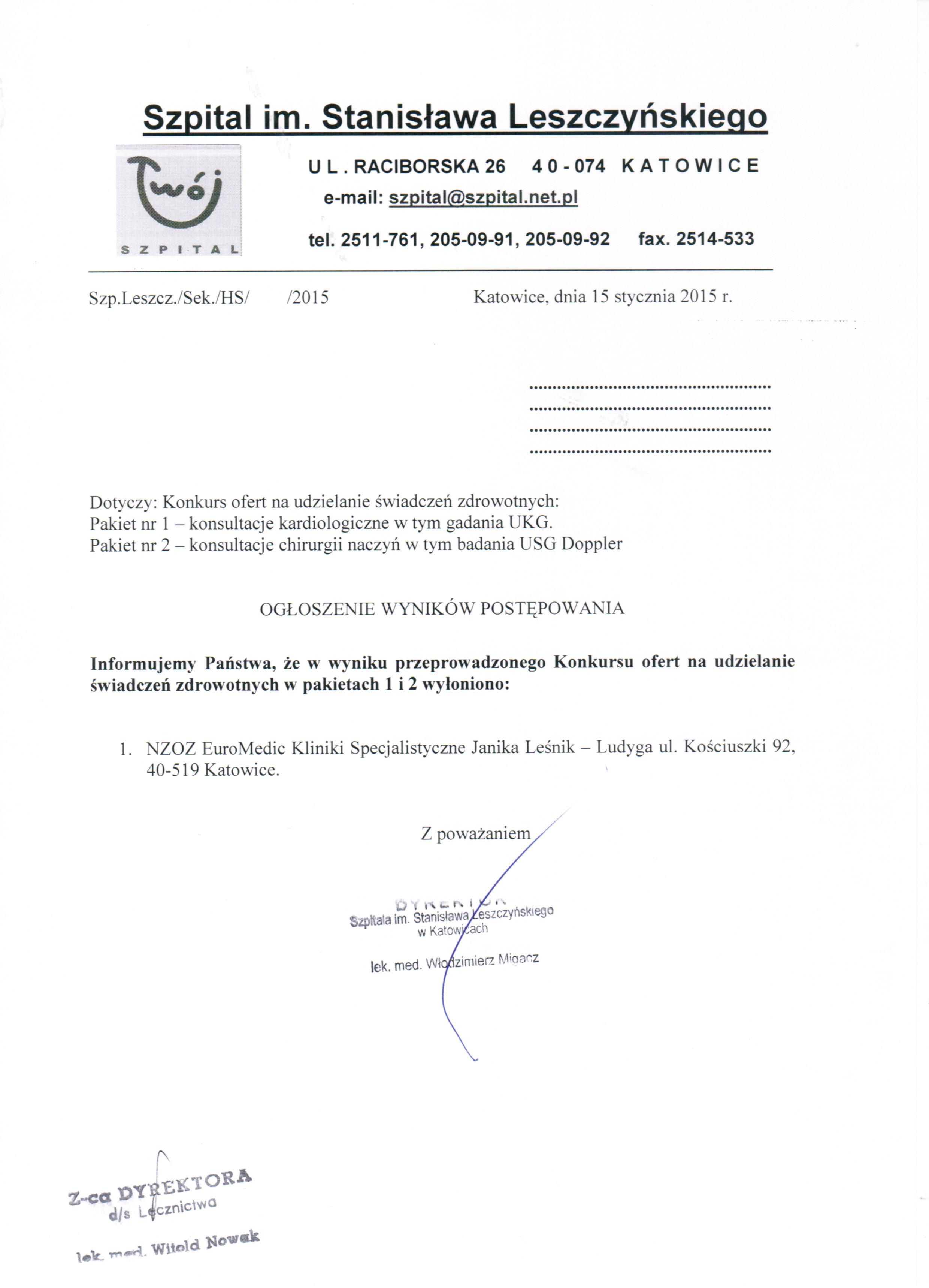 Dodatkowych informacji udziela Z-ca Dyrektora ds. Lecznictwa lek. med. Witold Nowak pod nr tel. (32) 251 17 61.