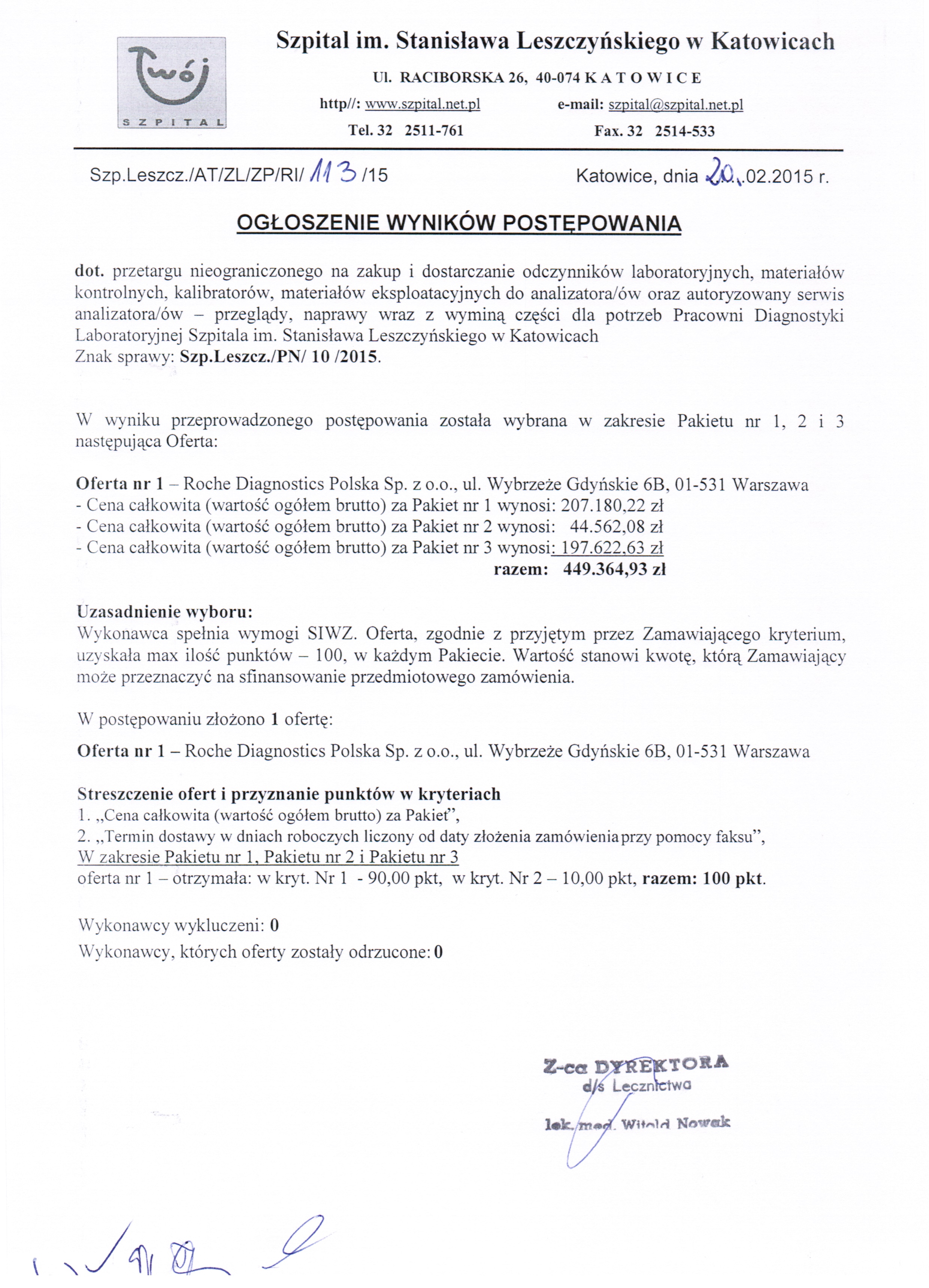 - Przetarg na dostawę odczynników, materiałów kontrolnych, kalibratorów, materiałów eksploatacyjnych do analizatora Integra 400 Plus będącego własnością Zamawiającego.