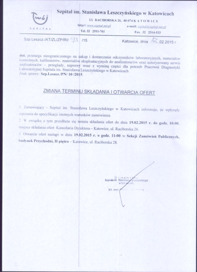 do dnia 17.02.2015 r. do godz. 10:00 w Szpitalu im. Stanisława Leszczyńskiego w Katowicach, ul. Raciborska 26 – Kancelaria Dyrektora.