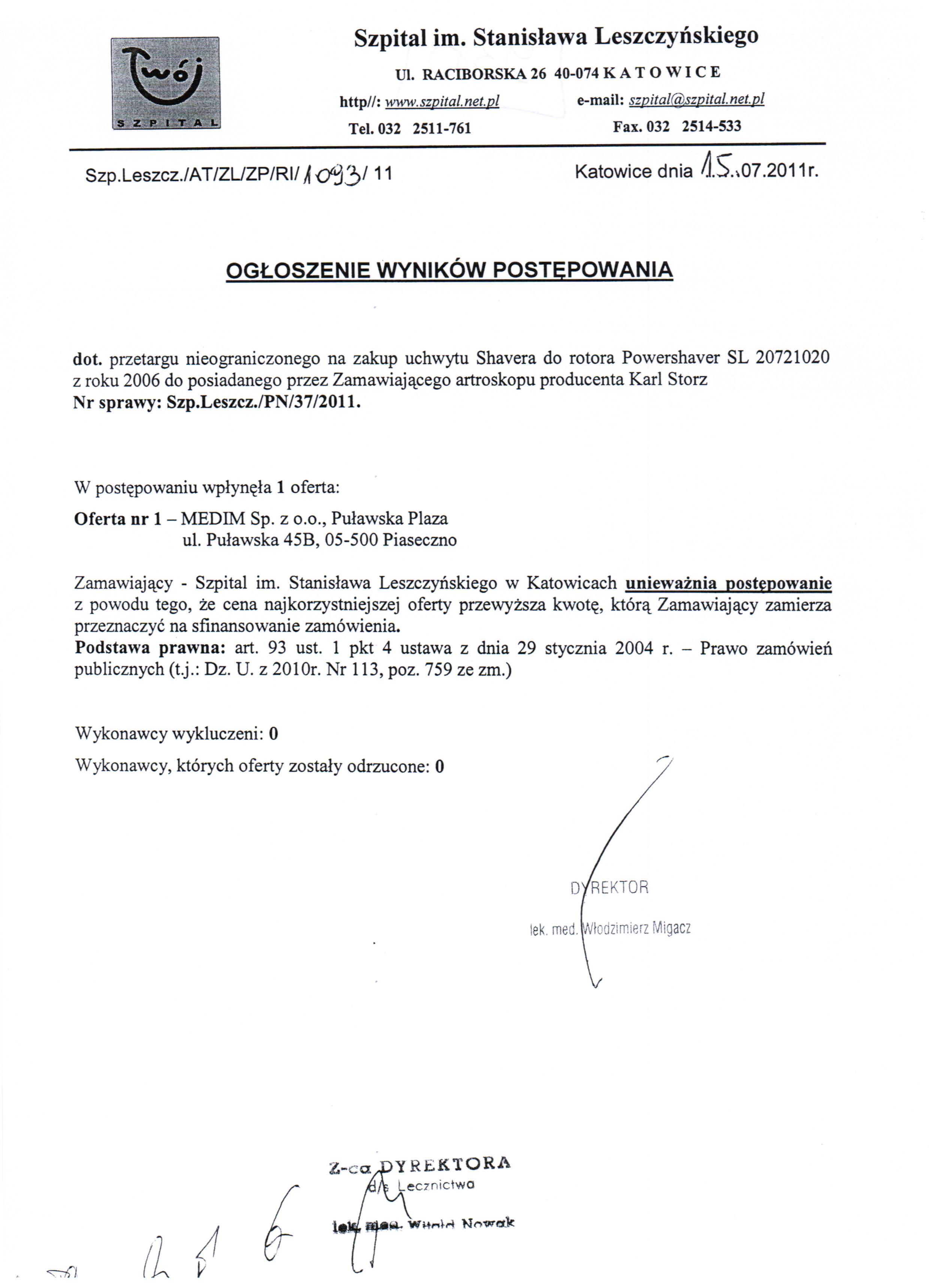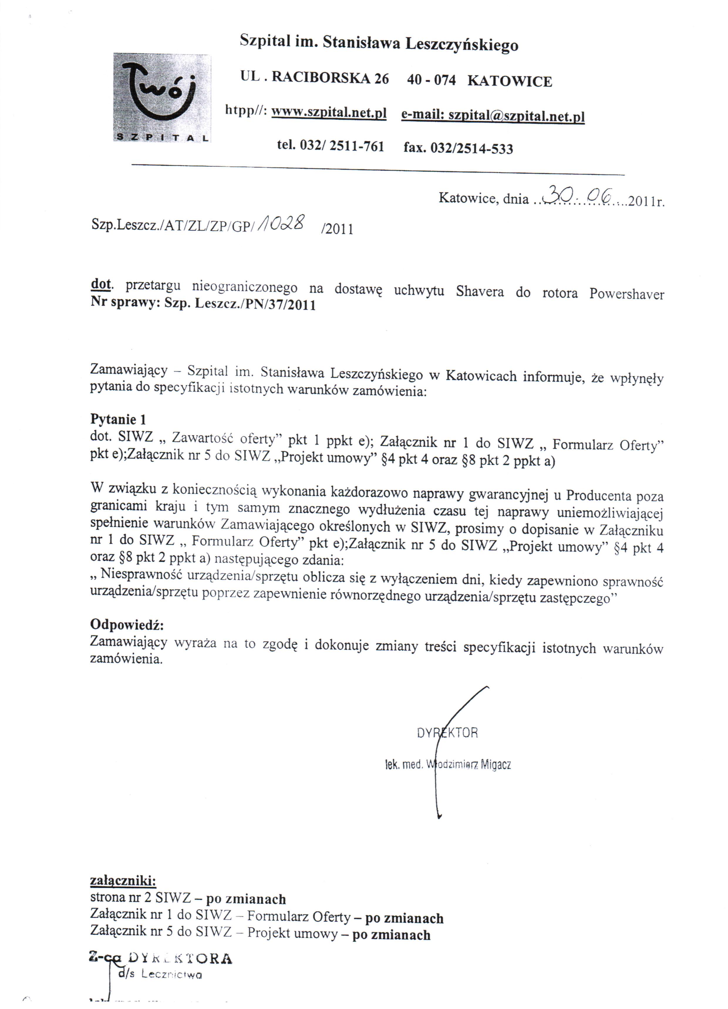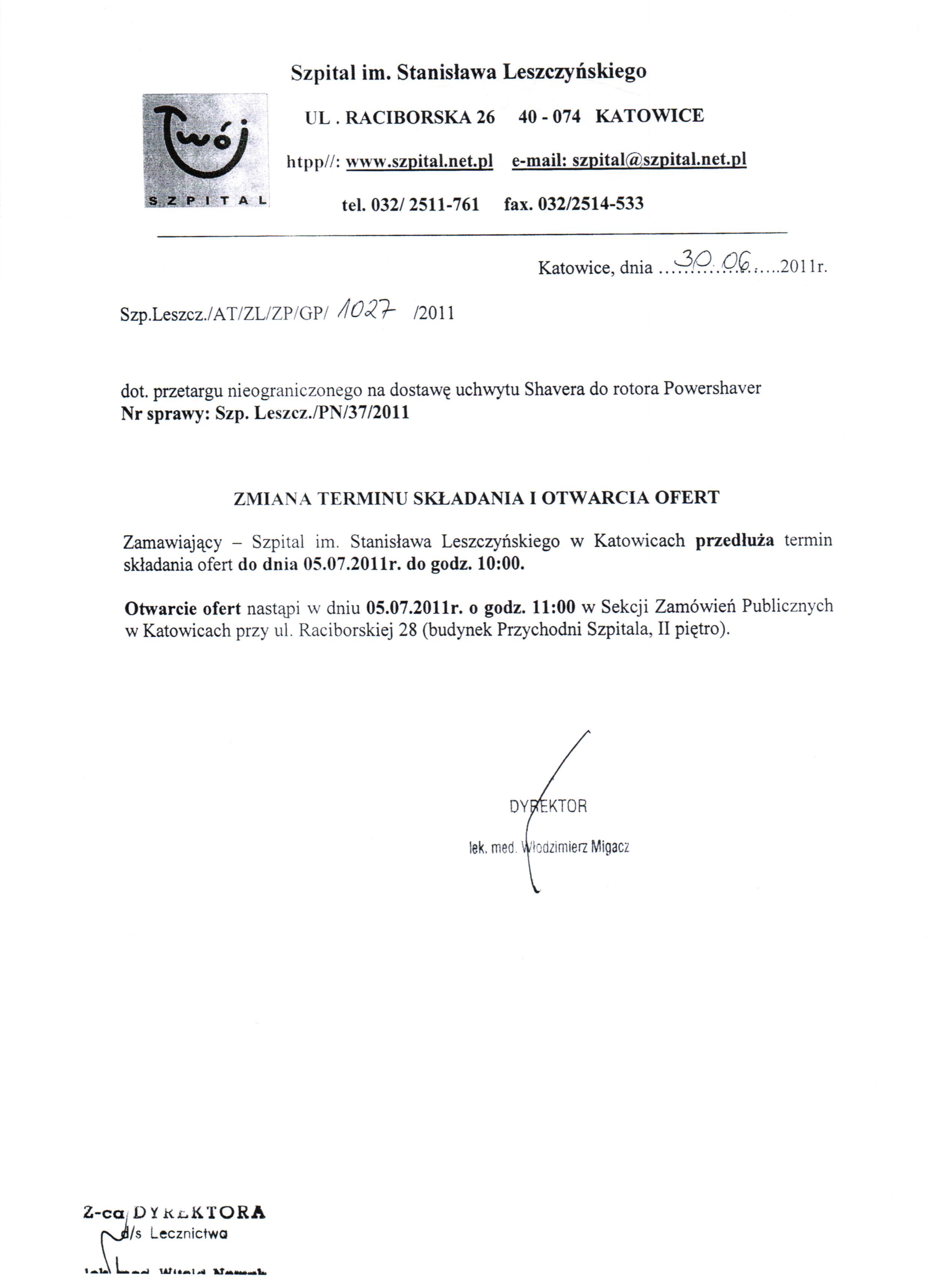 do dnia 01.07.2011r. do godz. 10:00 w Kancelarii Dyrektora Szpitala w Katowicach przy ul. Raciborskiej 26.
