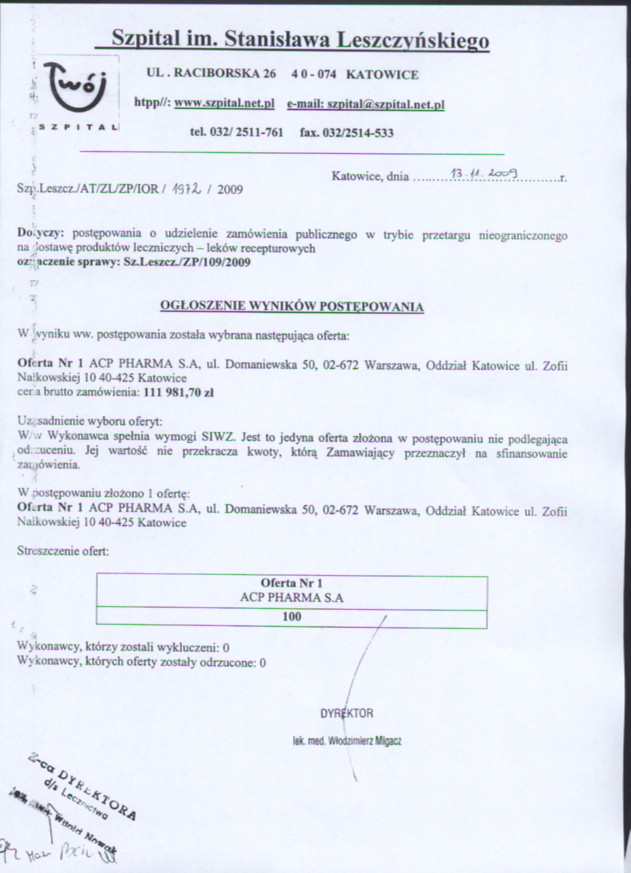 Oferty należy złożyć do dnia 03.11.2009r. do godz. 11:00 w Kancelarii Dyrektora Szpitala w Katowicach przy ul. Raciborskiej 26.