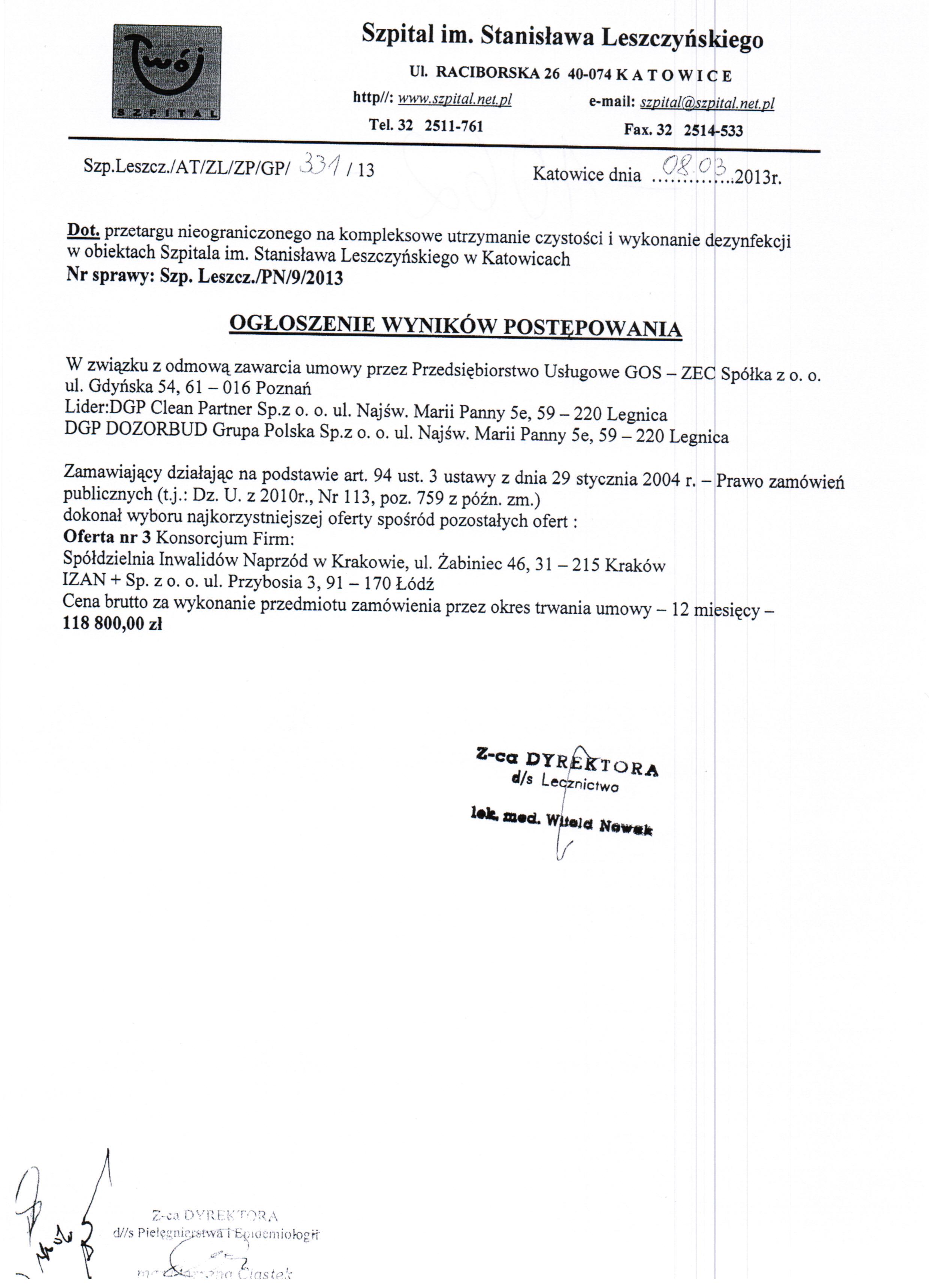ogłasza przetarg nieograniczony o wartości szacunkowej zamówienia powyżej 14.000 EURO na kompleksowe utrzymanie czystości i wykonanie dezynfekcji w obiektach Szpitala im. Stanisława Leszczyńskiego w Katowicach