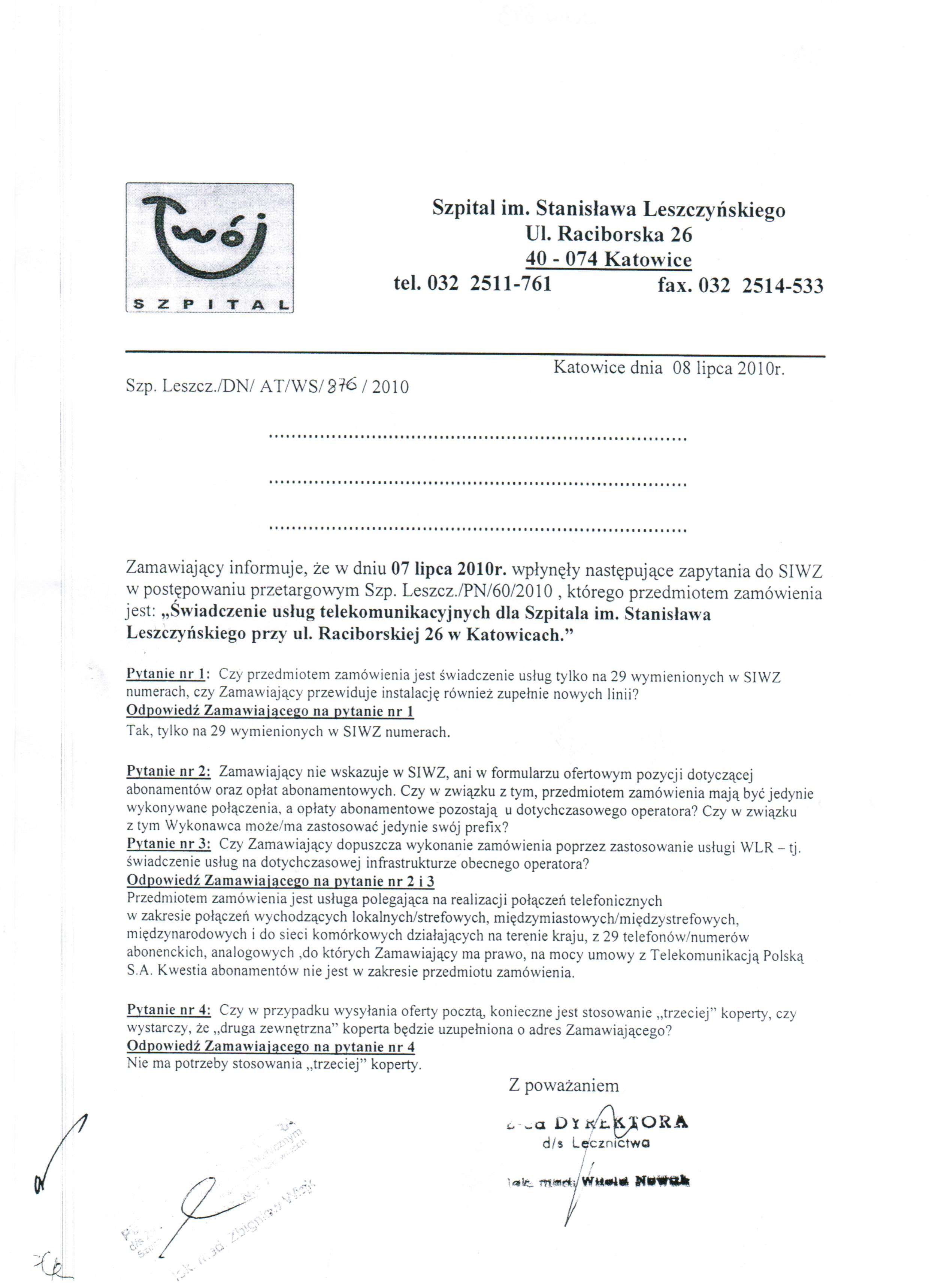 Oferty należy złożyć do dnia 21.07.2010r. do godz. 10:00 w Kancelarii Dyrektora Szpitala w Katowicach przy ul. Raciborskiej 26.