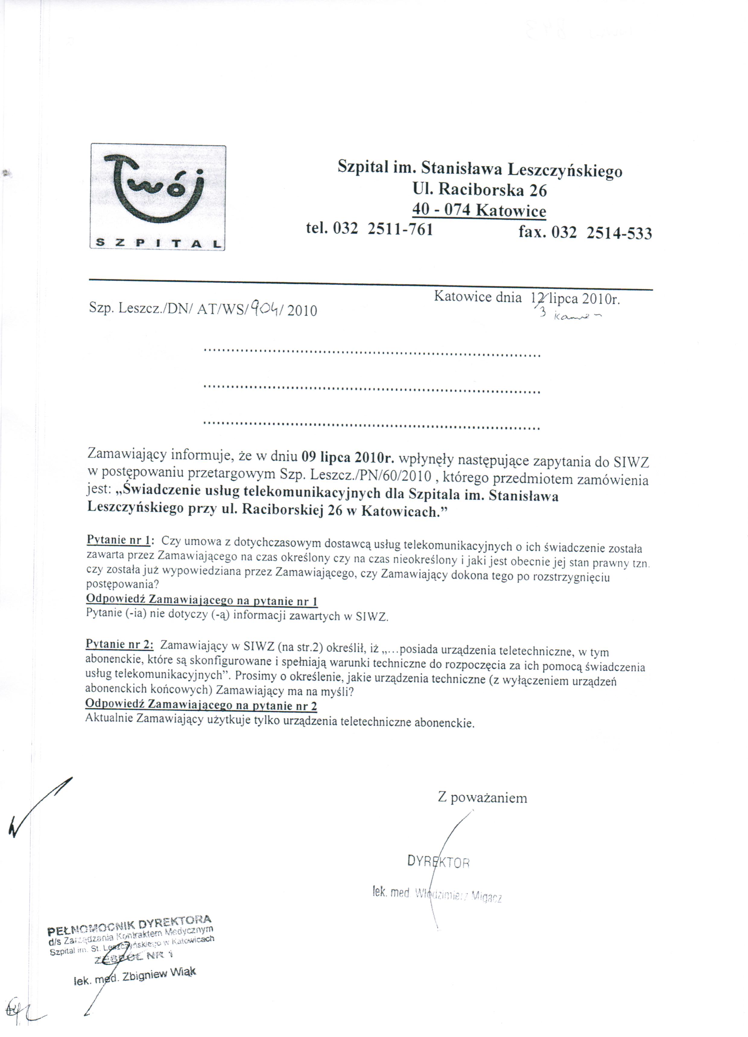 ogłasza przetarg nieograniczony o wartości szacunkowej zamówienia poniżej 14.000 EURO na świadczenie usług telekomunikacyjnych dla Szpitala im. Stanisława Leszczyńskiego przy ul. Raciborskiej 26 w Katowicach.
