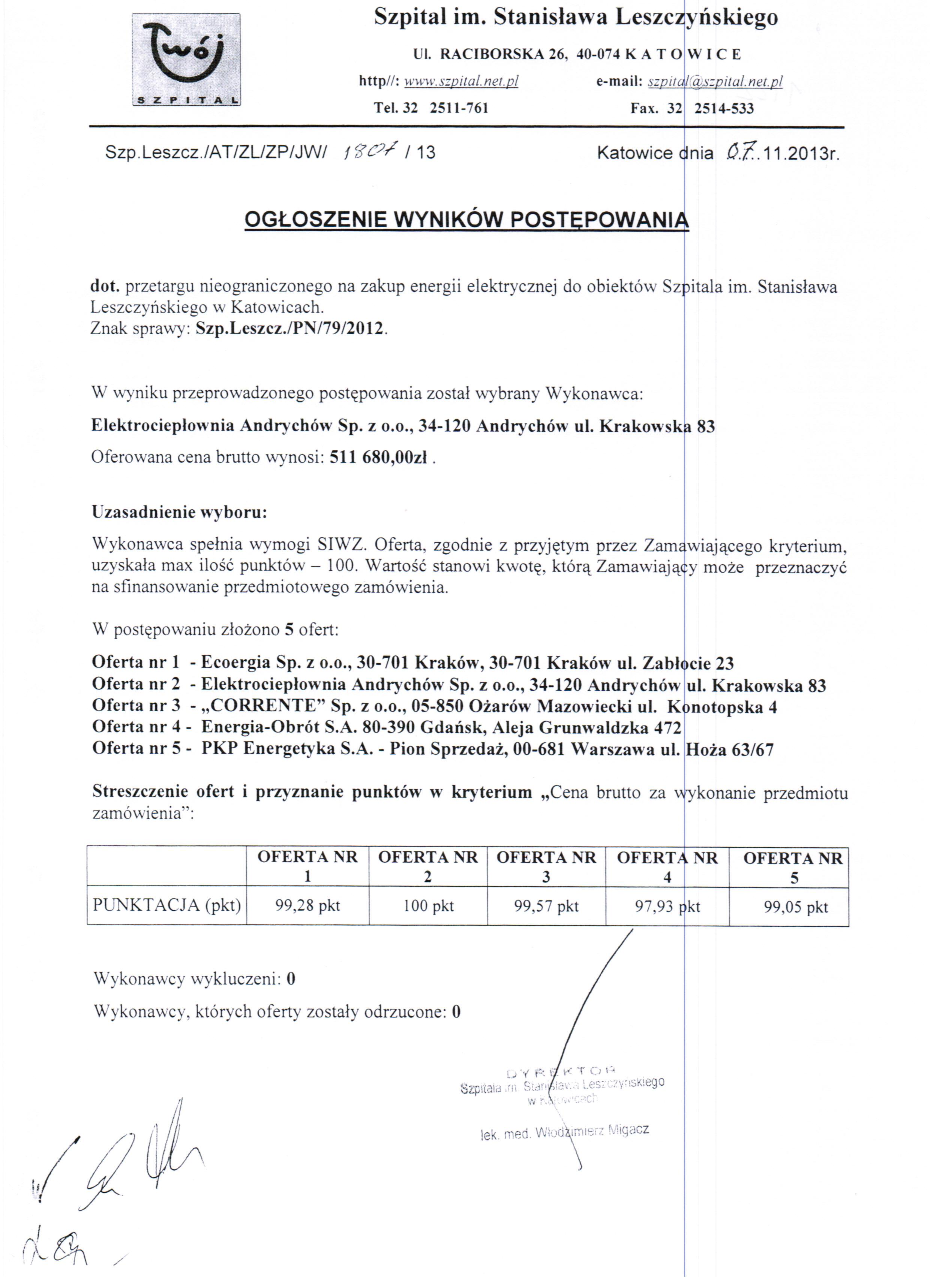 Ogłoszenie wyników postępowania (08.11.2013)