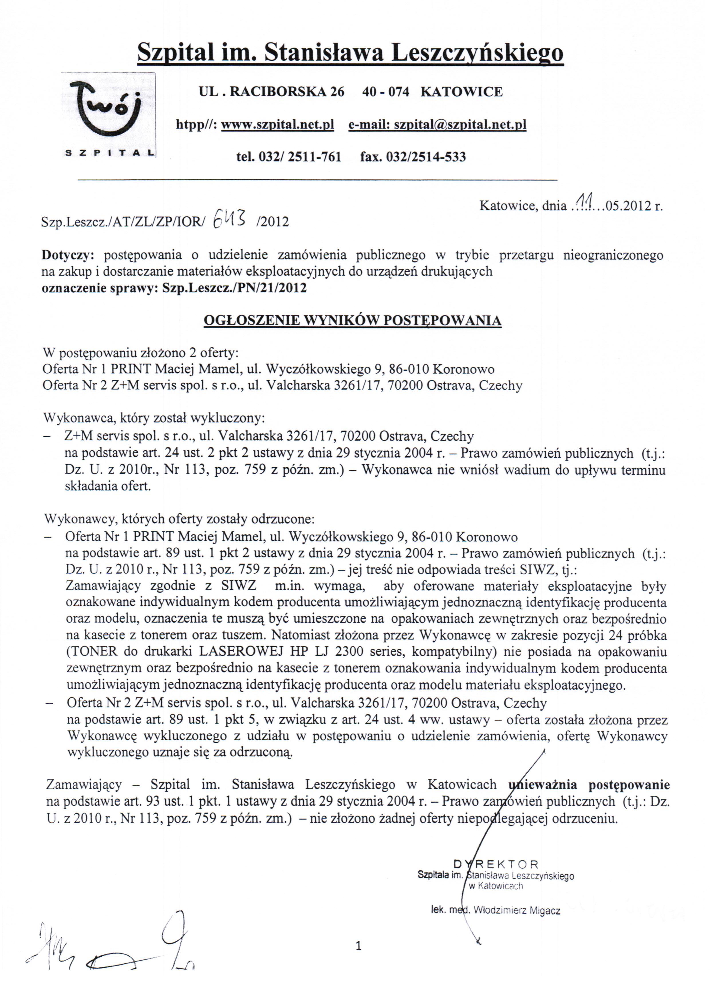w dniu 27.04.2012r. o godz. 11:00 w 40-074 Katowice, ulica Raciborska 28, budynek Przychodni, II piętro, Sekcja Zamówień Publicznych.
