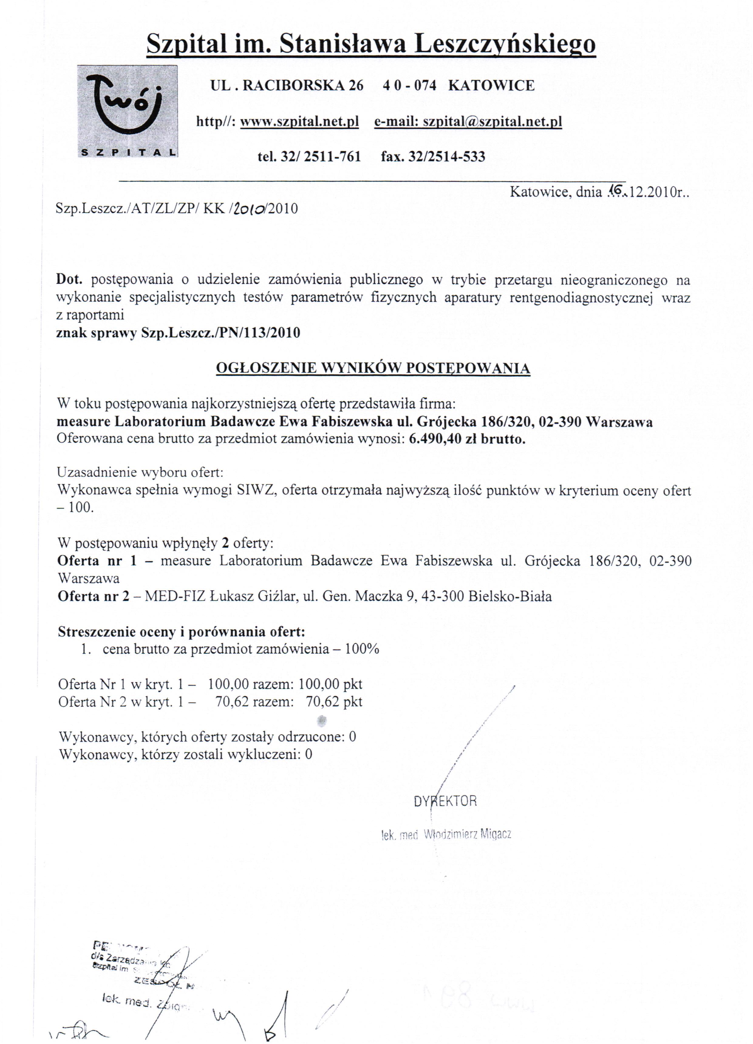 Oferty należy złożyć do dnia 09.12.2010r. do godz. 10:00 w Sekretariacie Dyrektora Szpitala w Katowicach przy ul. Raciborskiej 27 (w Budynku Zakładu Radioterapii na I piętrze).