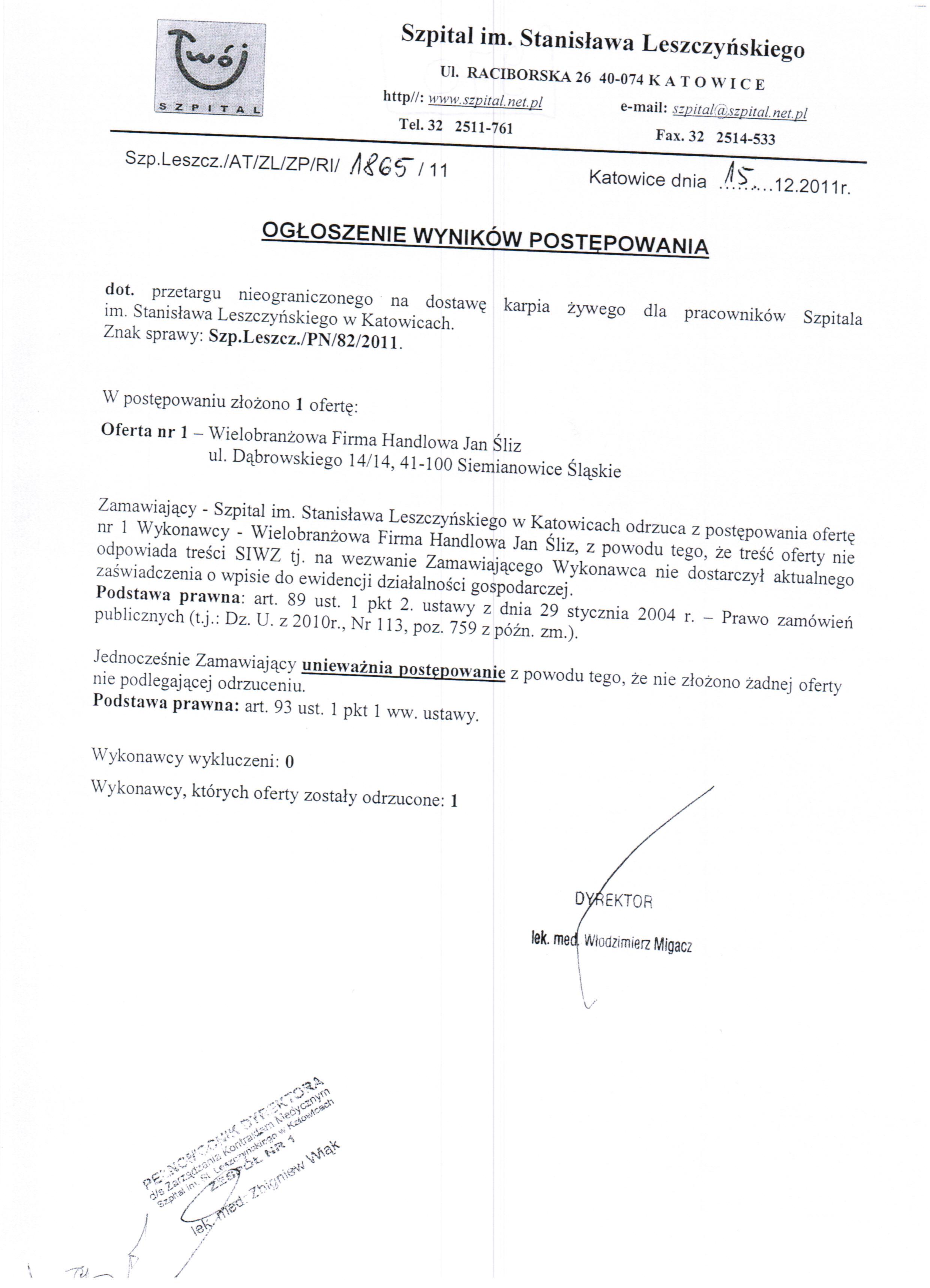 Oferty należy złożyć do dnia 25.11.2011r. do godz. 10:00 w Szpitalu im. Stanisława Leszczyńskiego w Katowicach ul. Raciborska 26 – Kancelaria Dyrektora.