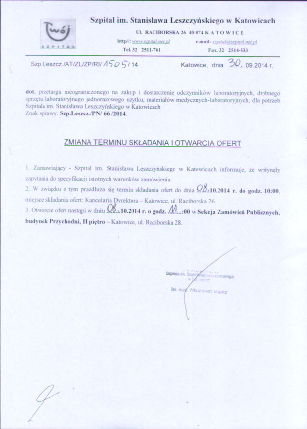 do dnia 02.10.2014 r. do godz. 10:00 w Szpitalu im. Stanisława Leszczyńskiego w Katowicach, ul. Raciborska 26 – Kancelaria Dyrektora.