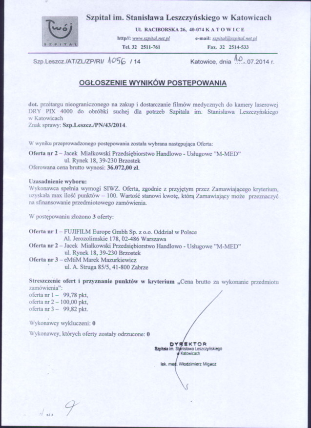 w dniu 01.07.2014 r. o godz. 11:00 w Szpitalu im. Stanisława Leszczyńskiego w Katowicach, ul. Raciborska 28, budynek Przychodni, II piętro, Sekcja Zamówień Publicznych.