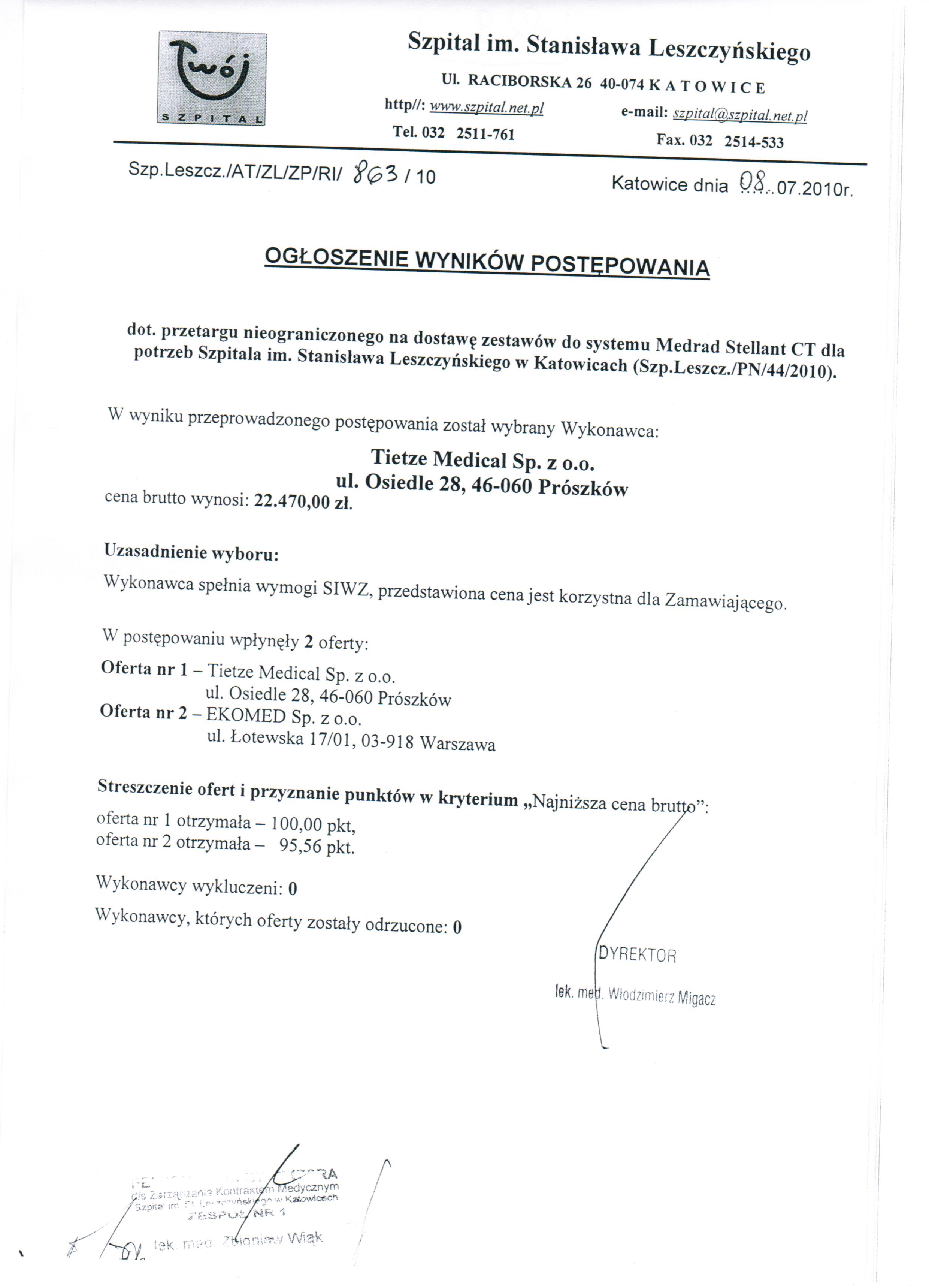 Otwarcie ofert nastąpi w dniu 21.06.2010r. o godz. 11.00 w Sali Konferencyjnej Zakładu Radioterapii w Katowicach przy ul. Raciborskiej 27.