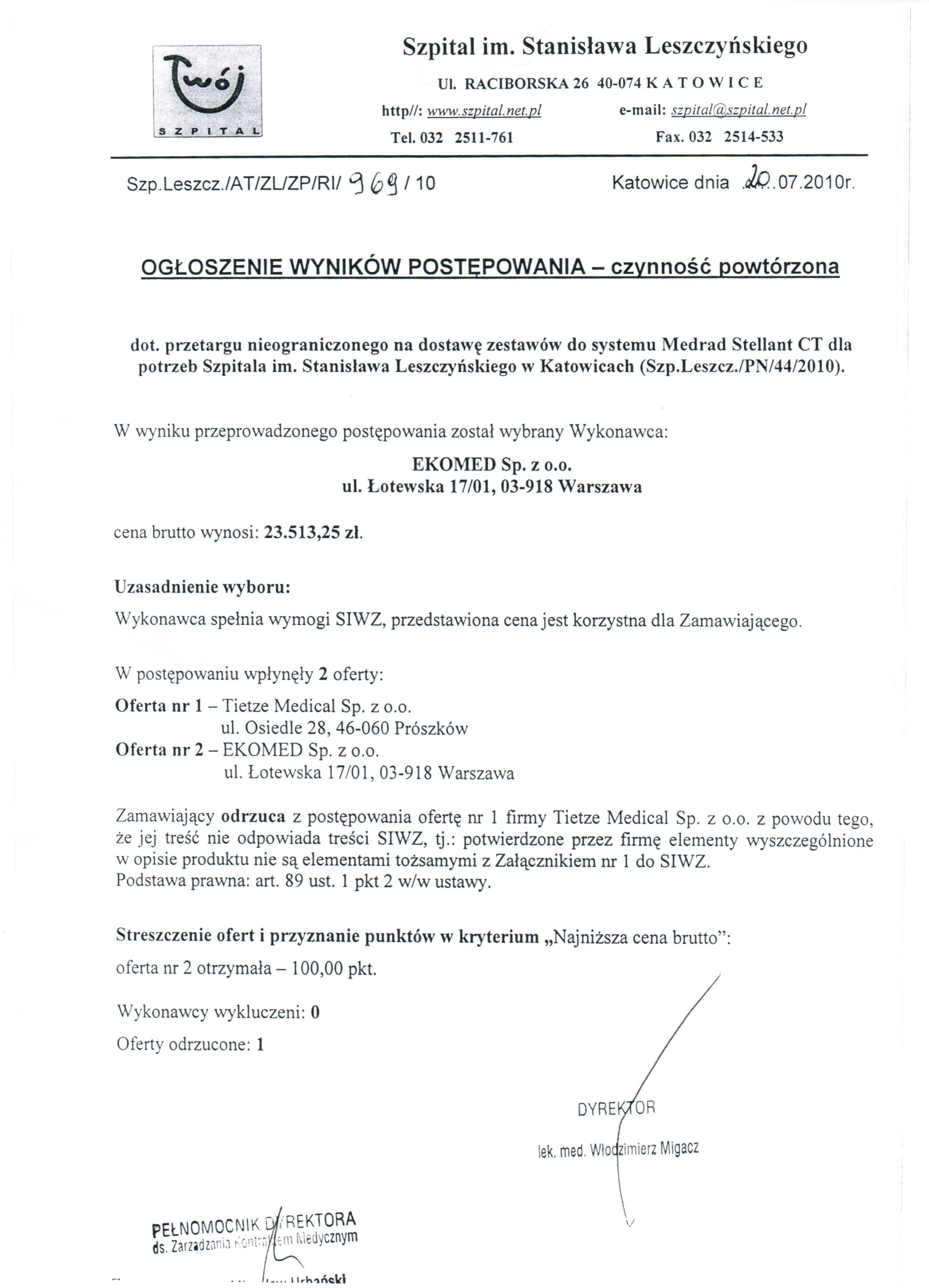 Oferty należy złożyć do dnia 21.06.2010r. do godz. 10.00 w Kancelarii Dyrektora Szpitala