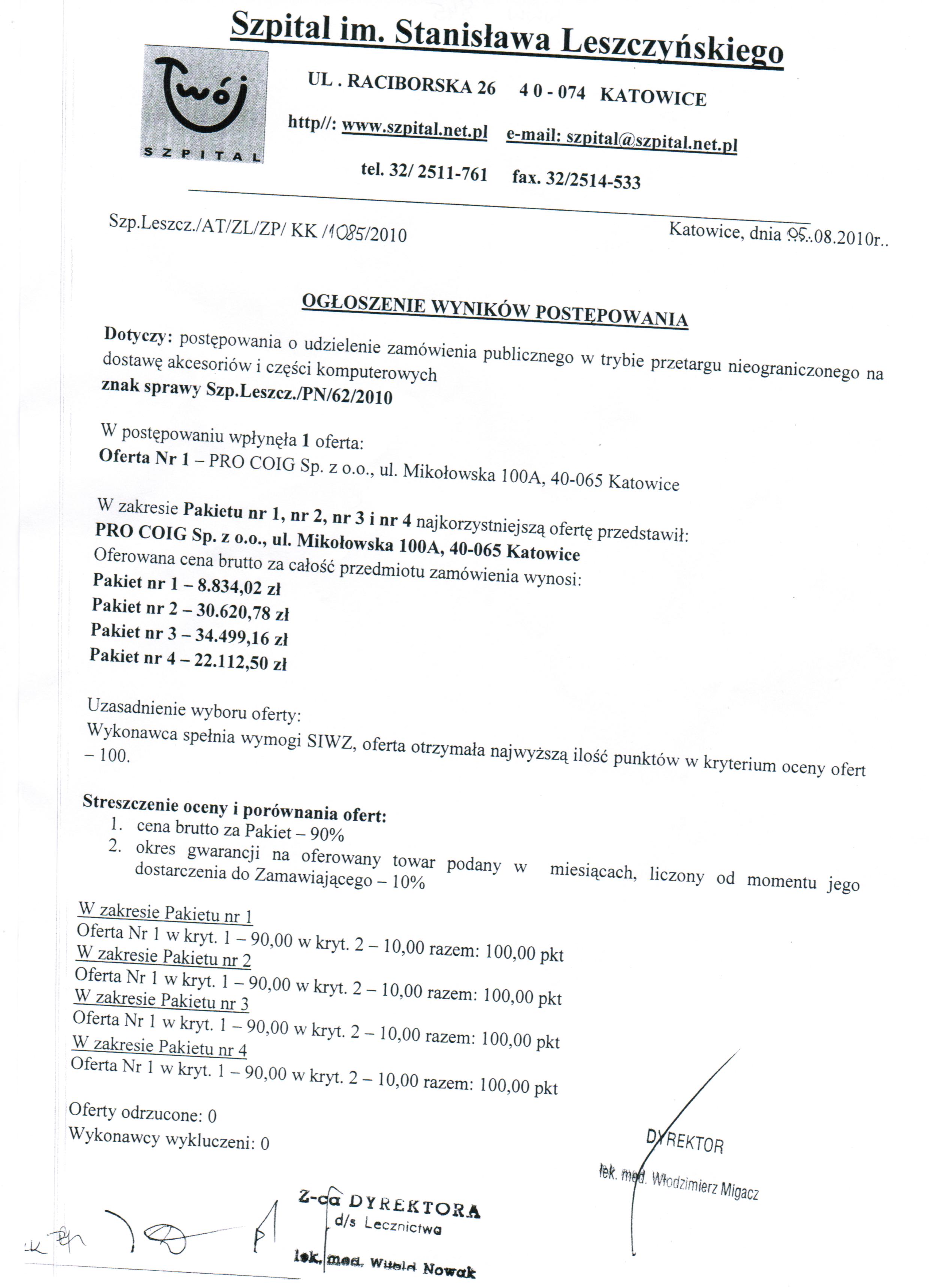 Oferty należy złożyć do dnia 15.07.2010r. do godz. 10:00 w Szpitalu im. Stanisława Leszczyńskiego w Katowicach ul. Raciborska 26 w Kancelarii Dyrektora Szpitala.