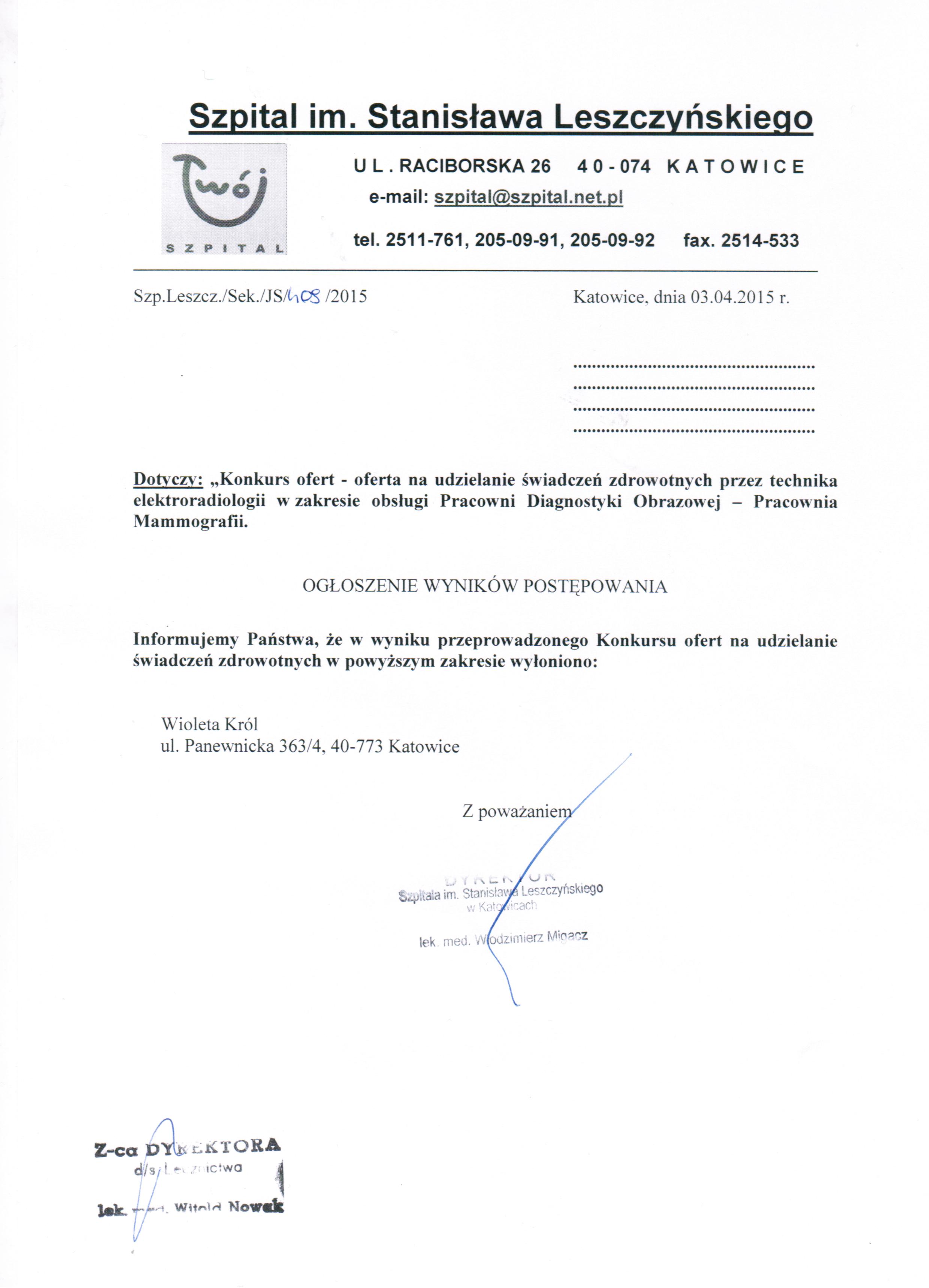 Szpital im. Stanisława Leszczyńskiego w Katowicach ul. Raciborska 26 zwany dalej Udzielającym Zamówienia ogłasza zamówienie na udzielanie świadczeń zdrowotnych przez technika elektroradiologii w zakresie obsługi Pracowni Diagnostyki Obrazowej – Pracownia Mammografii.