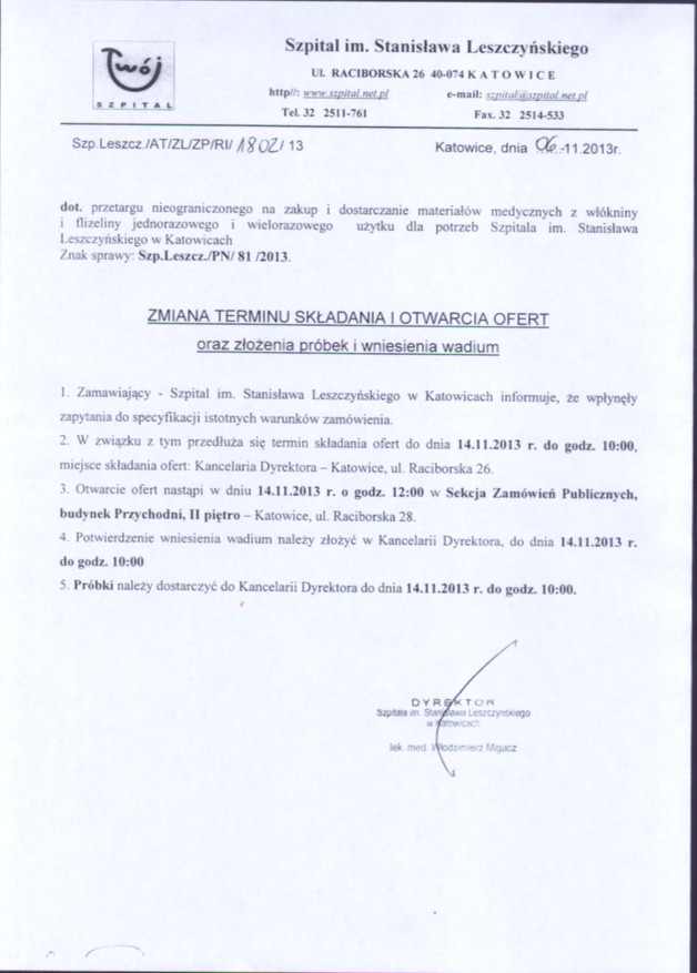 do dnia 08.11.2013 r. do godz. 10:00 w Szpitalu im. Stanisława Leszczyńskiego w Katowicach ul. Raciborska 26 – Kancelaria Dyrektora.