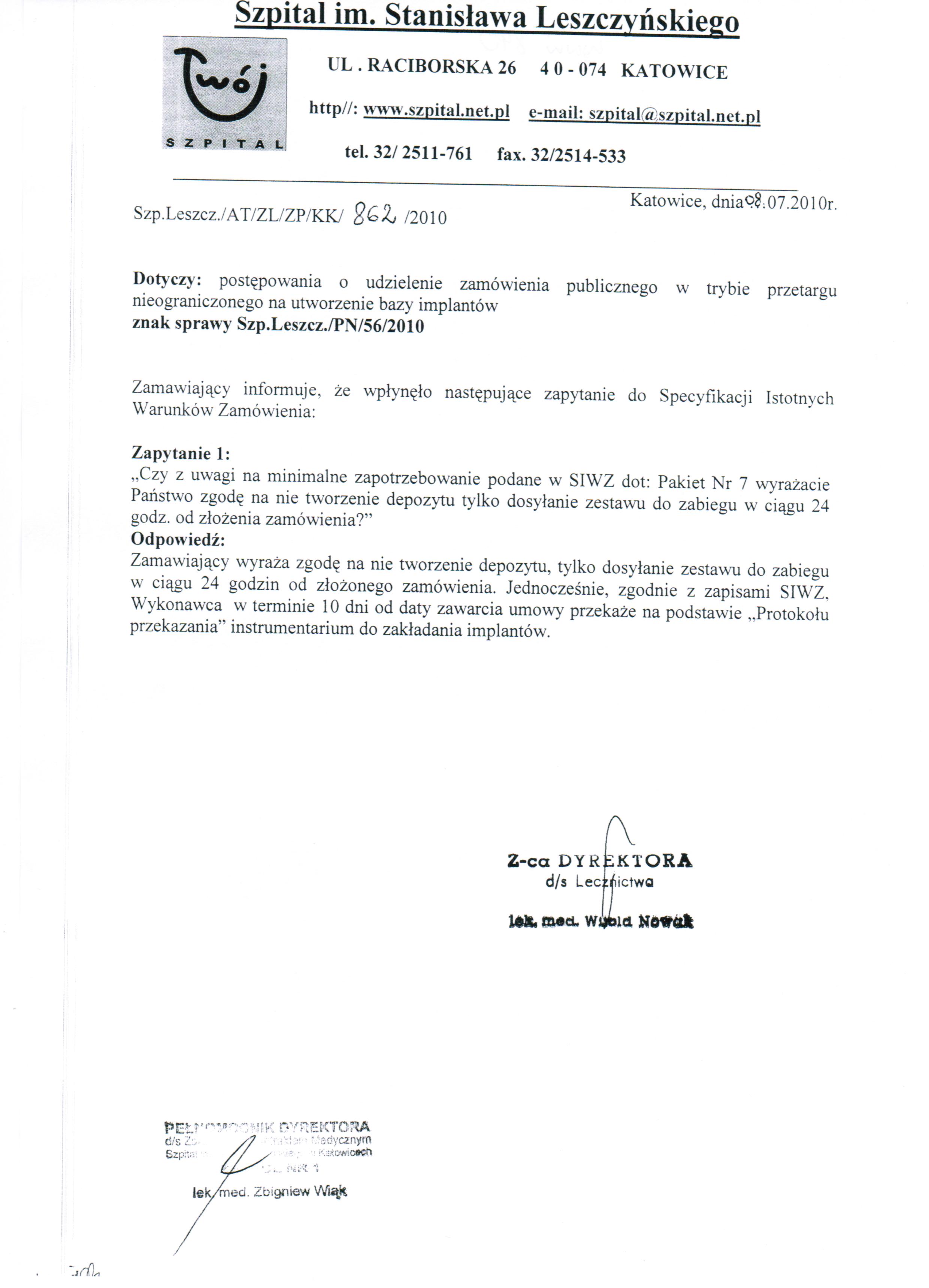 Osoba uprawniona do kontaktowania się z Wykonawcami - lek. med. Witold Nowak – Z-ca Dyrektora ds. Lecznictwa