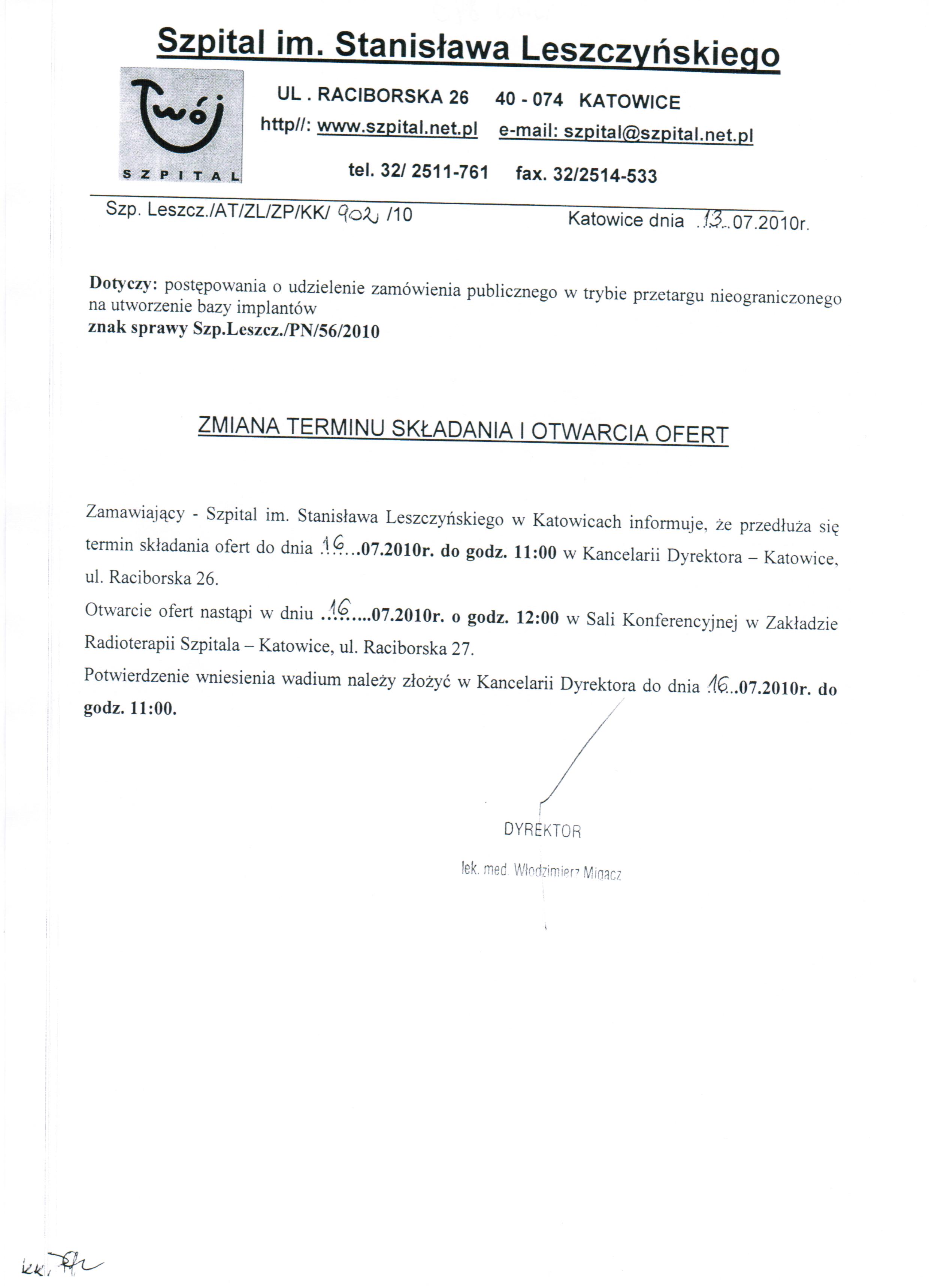 Oferty należy złożyć do dnia 14.07.2010r. do godz. 10:00 w Szpitalu im. Stanisława Leszczyńskiego w Katowicach ul. Raciborska 26 w Kancelarii Dyrektora Szpitala.