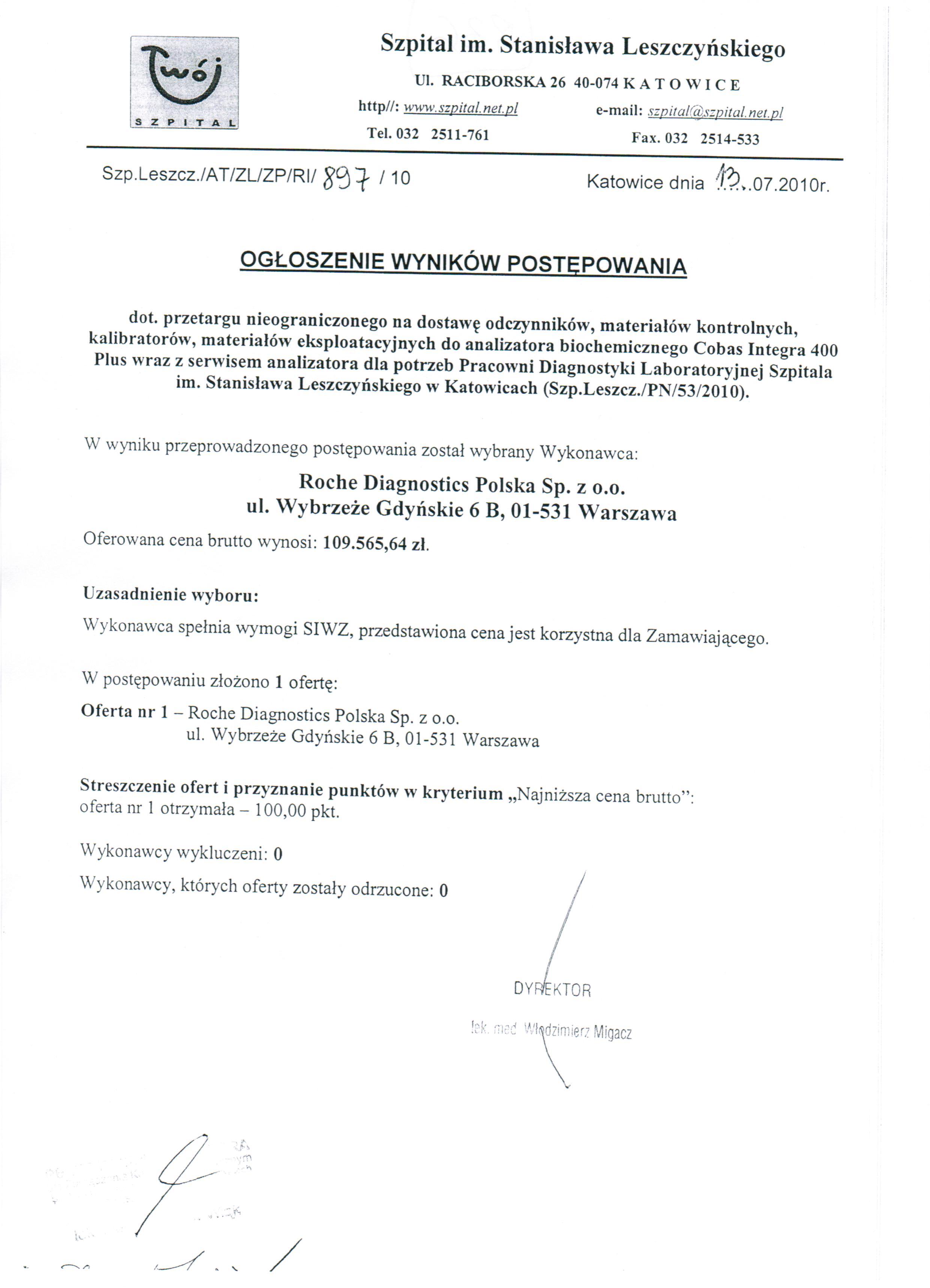 ogłasza przetarg nieograniczony o wartości szacunkowej zamówienia powyżej 14.000 EURO na dostawę odczynników, materiałów kontrolnych, kalibratorów, materiałów eksploatacyjnych do analizatora biochemicznego Cobas Integra 400 Plus wraz z serwisem analizatora dla potrzeb Pracowni Diagnostyki Laboratoryjnej Szpitala im. Stanisława Leszczyńskiego w Katowicach