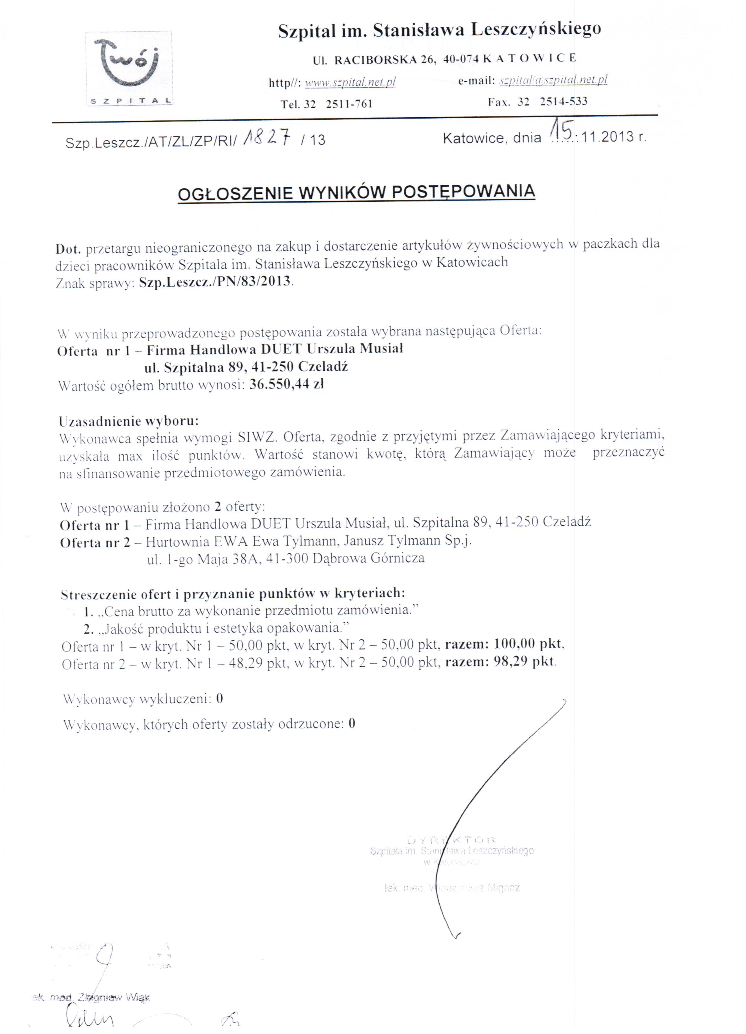Oferty należy złożyć do dnia 07.11.2013 r. do godz. 10:00 w Szpitalu im. Stanisława Leszczyńskiego w Katowicach ul. Raciborska 26 – Kancelaria Dyrektora.