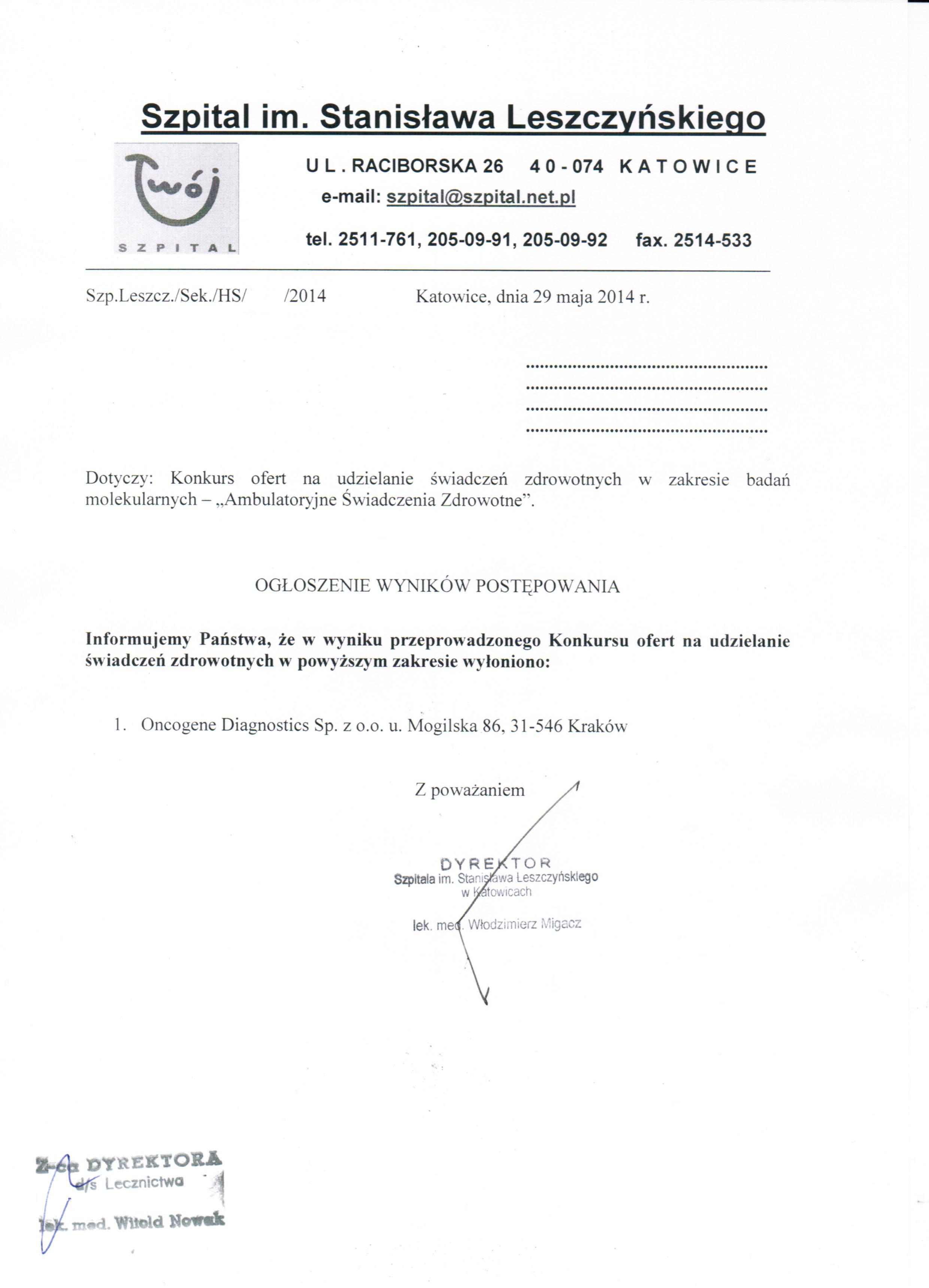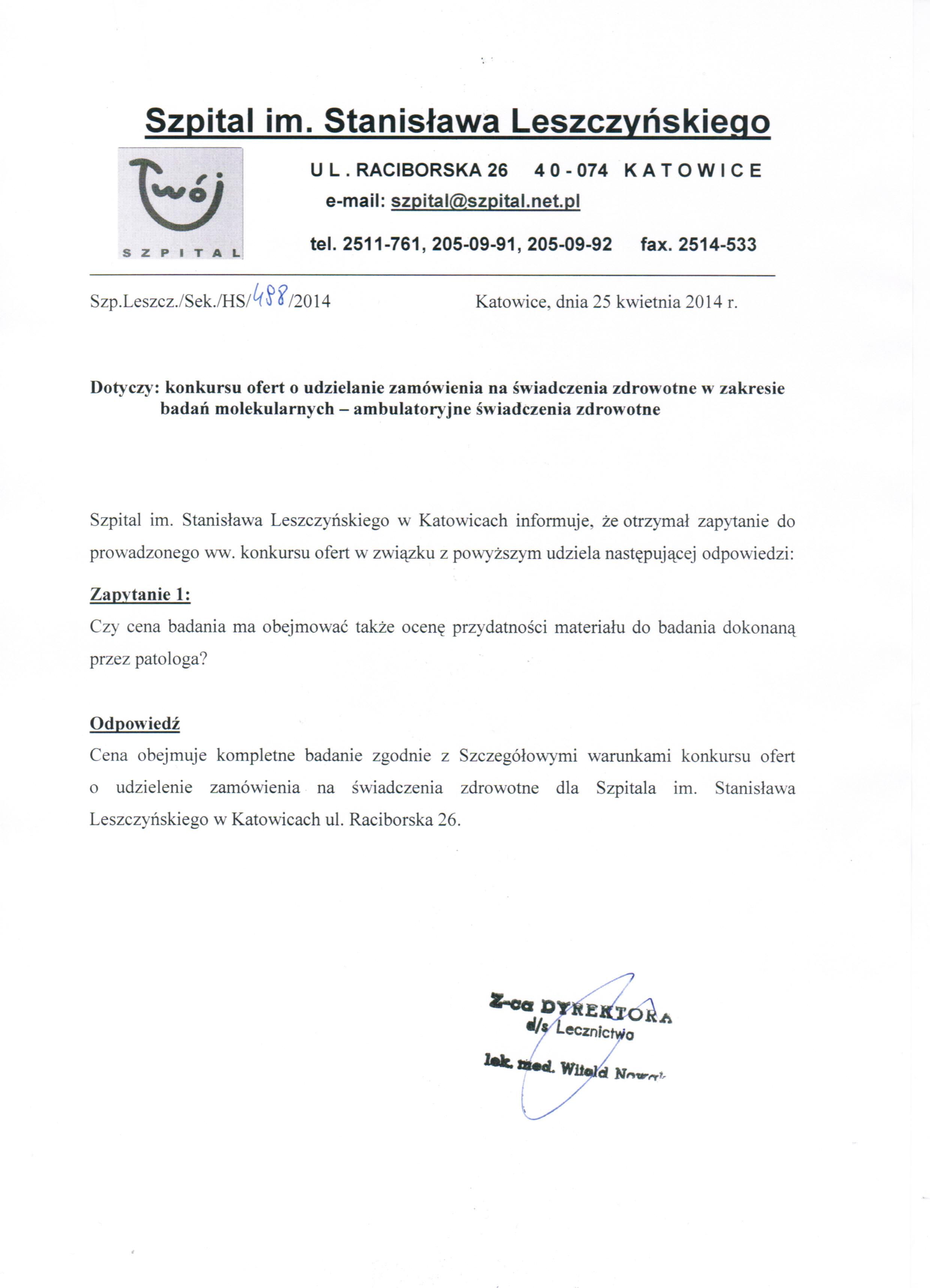 Dodatkowych informacji udziela Z-ca Dyrektora ds. Lecznictwa lek. med. Witold Nowak pod nr tel. (32) 251 17 61.