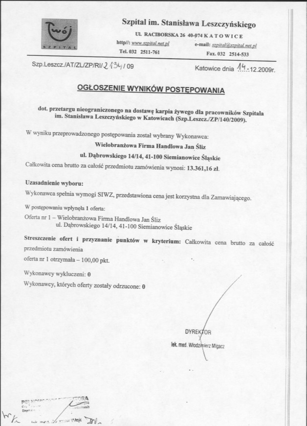 Oferty należy złożyć do dnia 11.12.2009r. do godz. 10:00 w Szpitalu im. Stanisława Leszczyńskiego w Katowicach ul. Raciborska 26 w Kancelarii Dyrektora Szpitala.