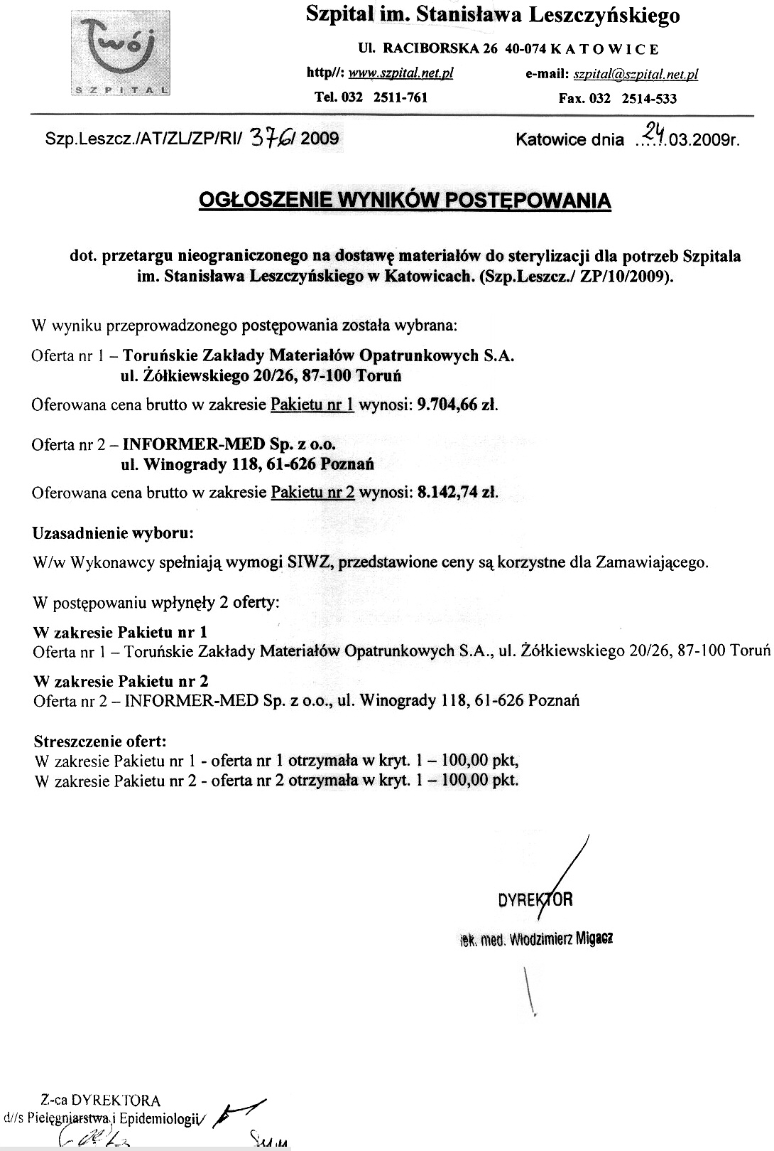 W związku z tym przedłuża się termin składania ofert do dnia 09.03.2009r. do godz. 10:00 w Kancelarii Dyrektora - Katowice, ul. Raciborska 26.