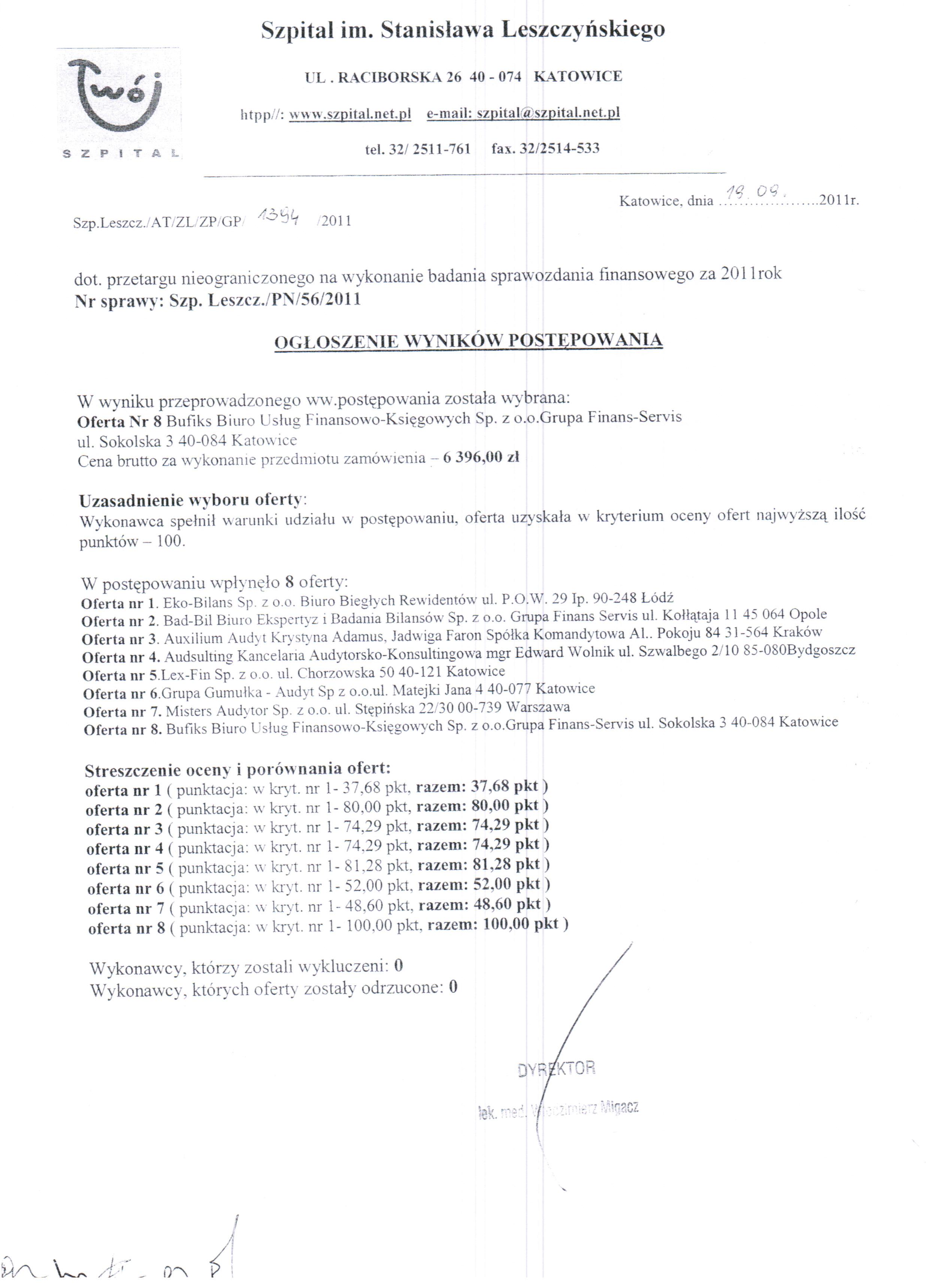Otwarcie ofert nastąpi w dniu 14.09.2011r. o godz. 11:00 w 40-074 Katowice, ulica Raciborska 28, budynek Przychodni, II piętro, Sekcja Zamówień Publicznych.