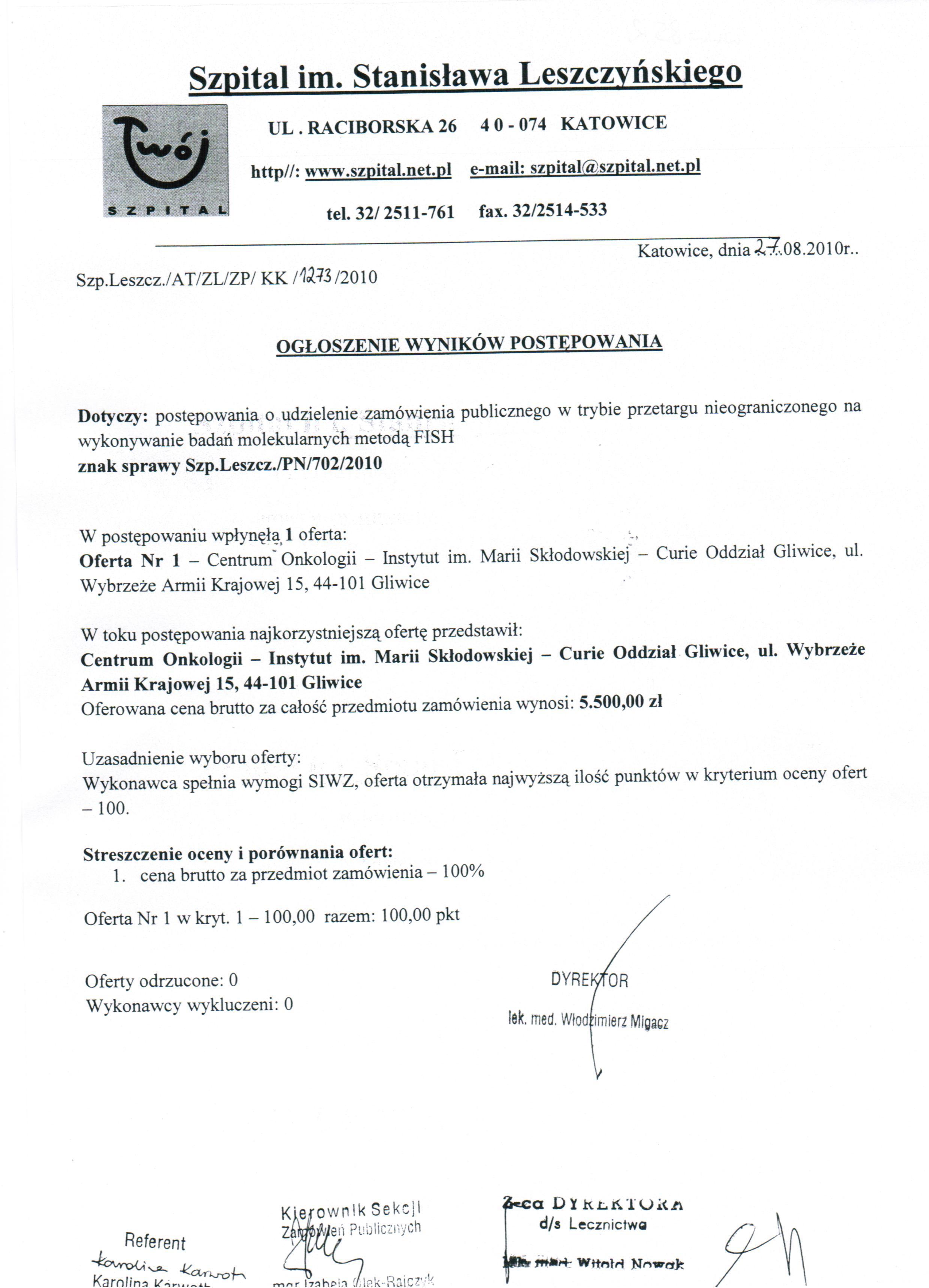 Oferty należy złożyć do dnia 24.08.2010 r. do godz. 10:00 w Budynku Zakładu Radioterapii w Katowicach przy ul. Raciborskiej 27, I piętro, Sekretariat Dyrektora.