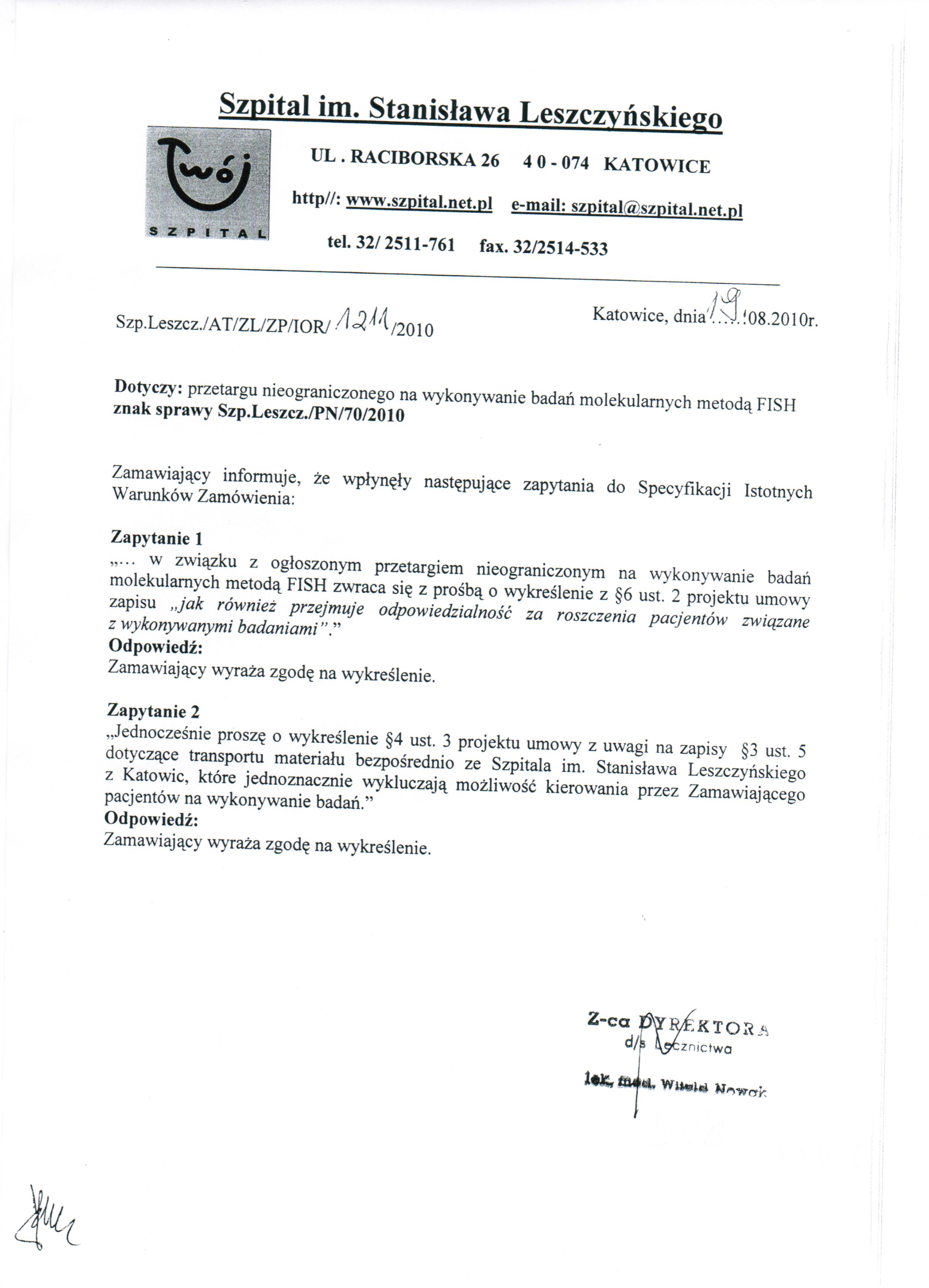 Otwarcie ofert nastąpi w dniu 24.08.2010 r. o godz. 11:00 w Budynku Poradni Szpitalnej w Katowicach przy ul. Raciborskiej 28 (II piętro).