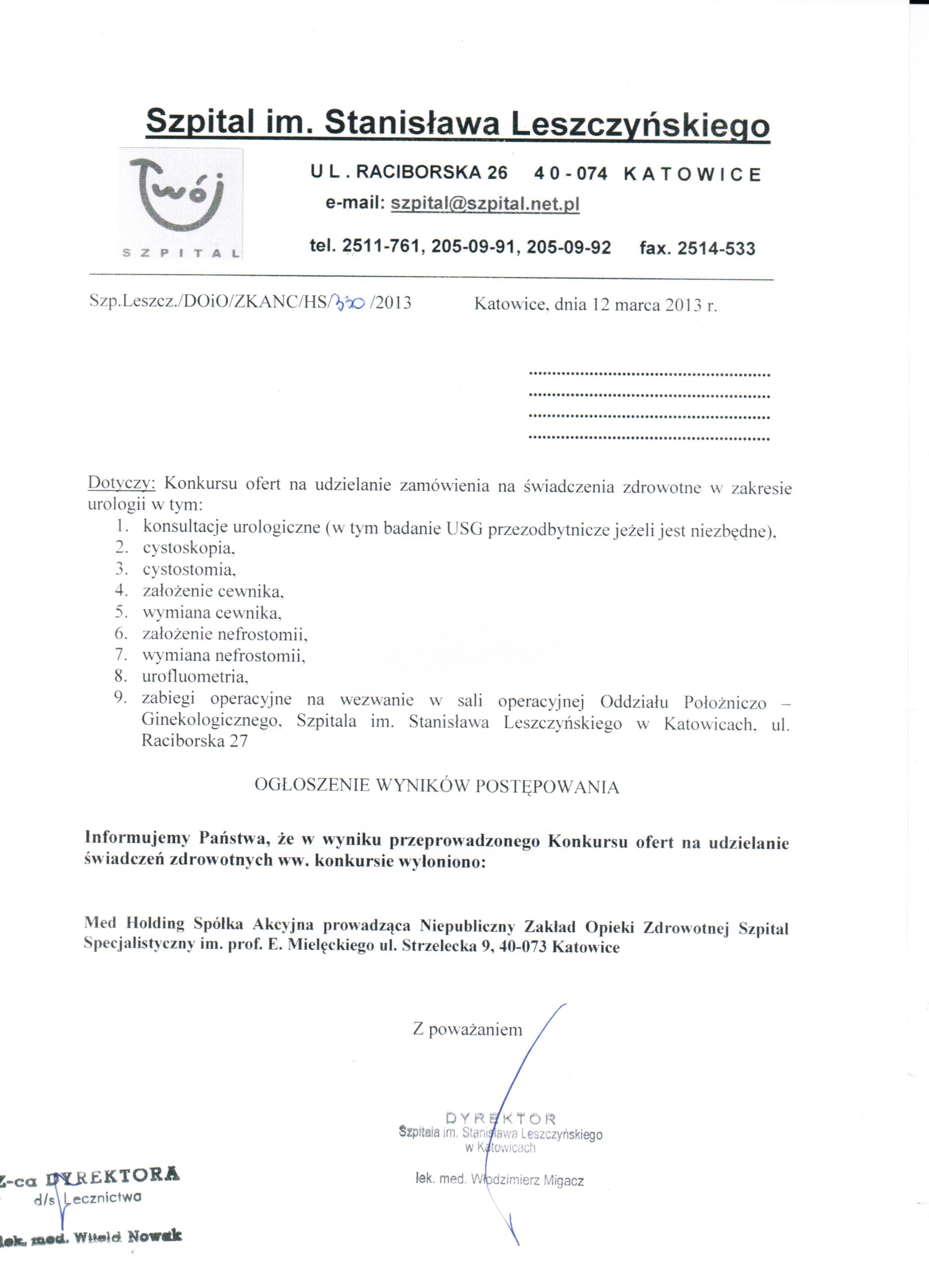 "Konkurs ofert - oferta na świadczenia zdrowotne w zakresie urologii dla pacjentów Szpitala im. Stanisława Leszczyńskiego w Katowicach".