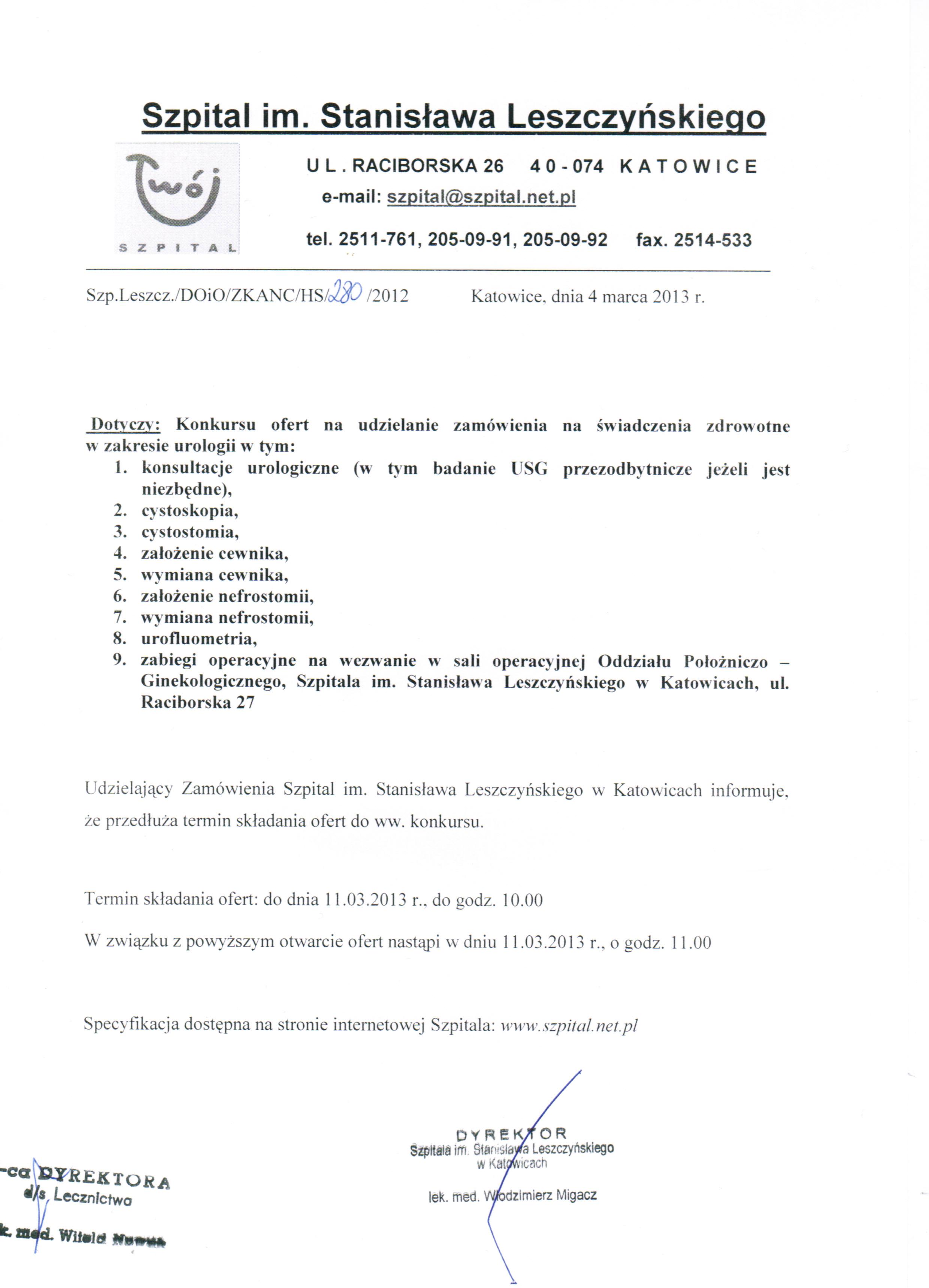 Szpital im. Stanisława Leszczyńskiego w Katowicach ul. Raciborska 26 zwany dalej Udzielającym Zamówienia ogłasza zamówienie na udzielanie świadczeń zdrowotnych w zakresie urologii w tym: