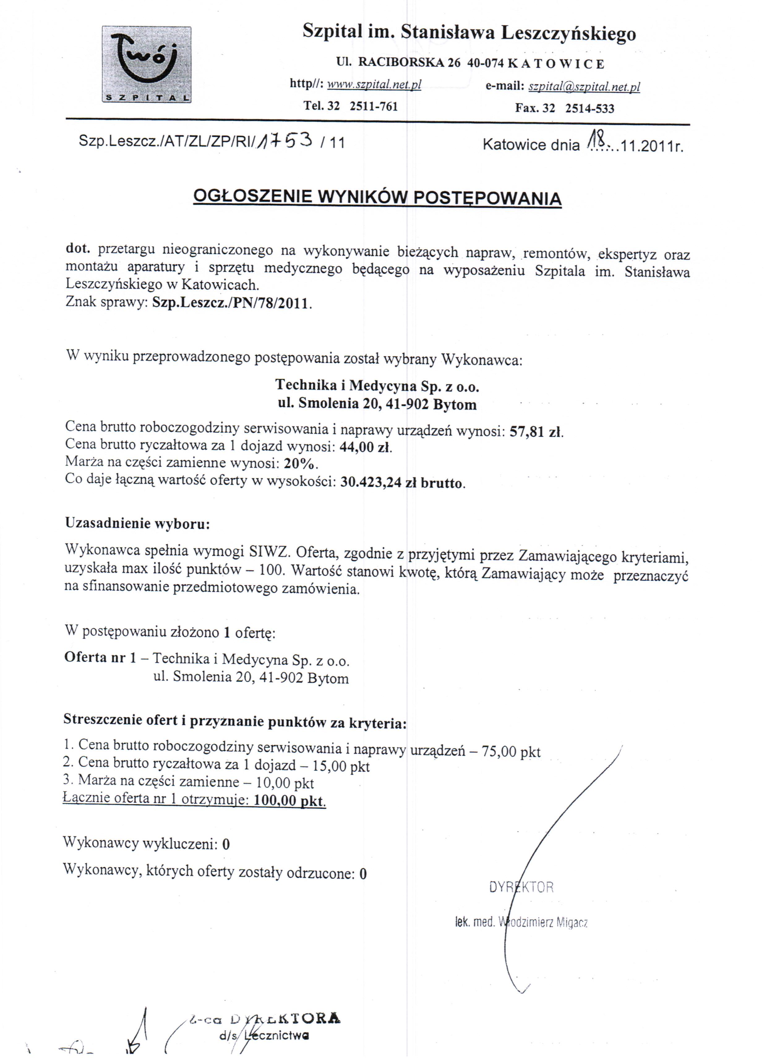 w dniu 10.11.2011r. o godz. 11:00 w Szpitalu im. Stanisława Leszczyńskiego w Katowicach ul. Raciborska 28, budynek Przychodni, II piętro, Sekcja Zamówień Publicznych.