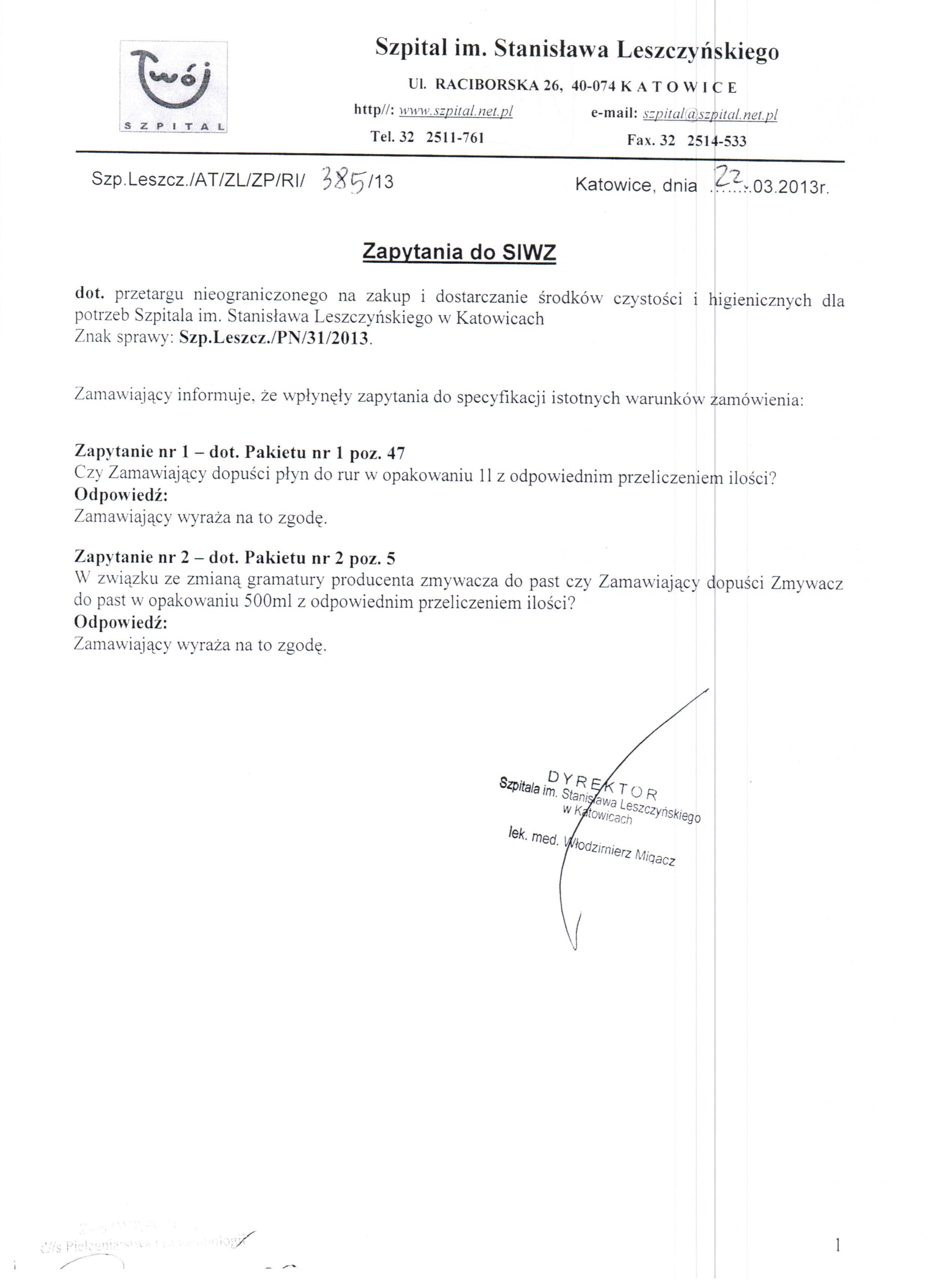 SIWZ można uzyskać pod adresem: Szpital im. Stanisława Leszczyńskiego, 40-074 Katowice, ul. Raciborska 26 – Dział Księgowości.