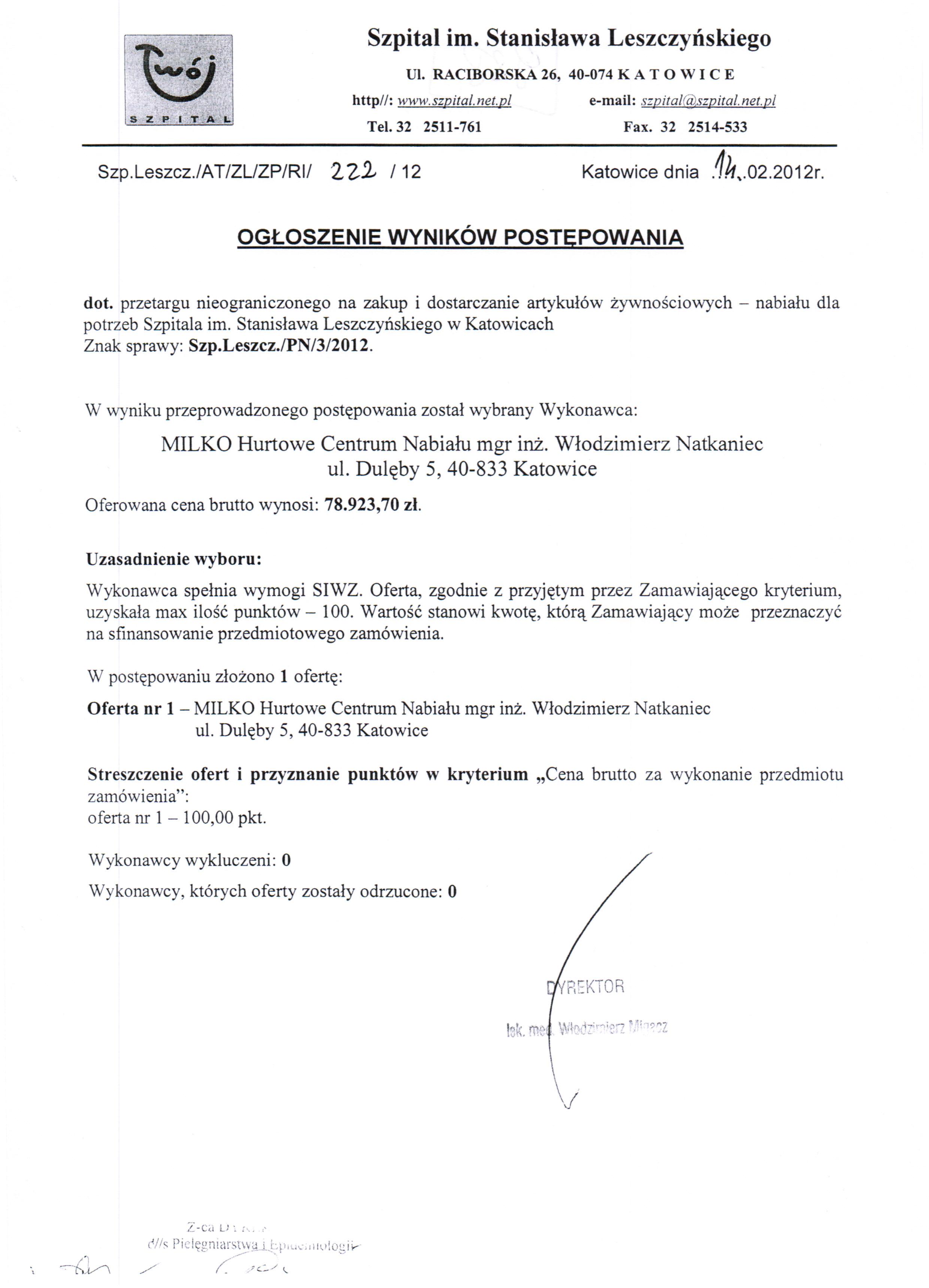do dnia 01.02.2012 r. do godz. 10:00 w Szpitalu im. Stanisława Leszczyńskiego w Katowicach ul. Raciborska 26 – Kancelaria Dyrektora.