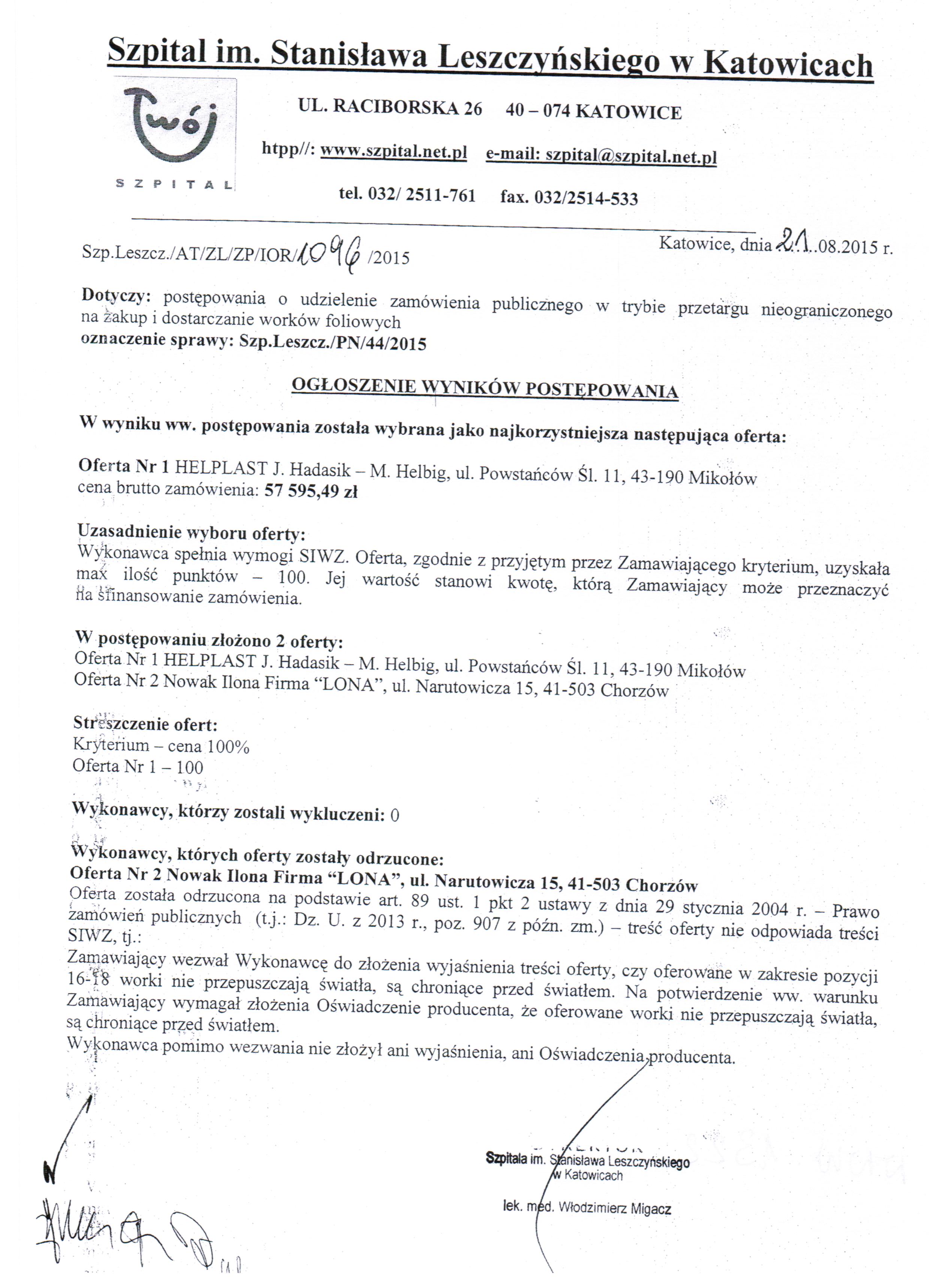 w dniu 10.08.2015r. o godz. 11:00 w 40-074 Katowice, ulica Raciborska 28, budynek Przychodni, II piętro, Sekcja Zamówień Publicznych.