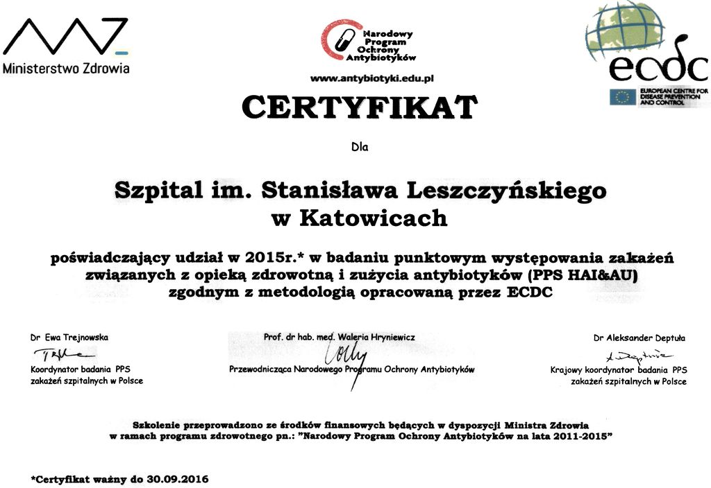 Szpital im. Stanisława Leszczyńskiego w Katowicach informuje o uzyskaniu Certyfikatu poświadczającego udział w 2015 roku w badaniu punktowym występowania zakażeń związanych z opieką zdrowotną i zużycia antybiotyków (PPS HAI&AU) zgodnym z metodologią opracowaną przez ECDC.