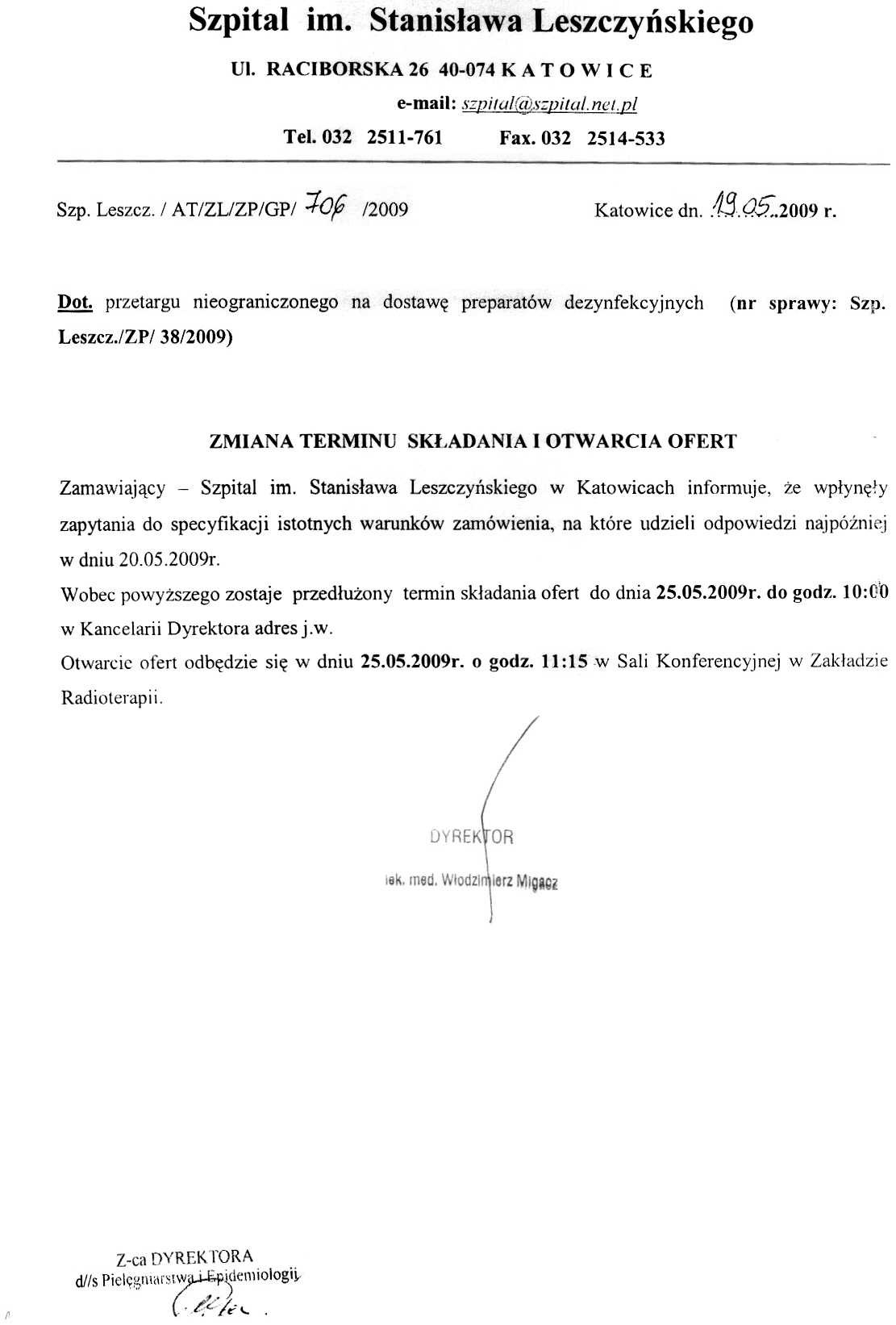 do dnia 21.05.2009r. do godz. 10.00 w Kancelarii Dyrektora Szpitala im. Stanisława Leszczyńskiego w Katowicach, przy ul. Raciborskiej 26.