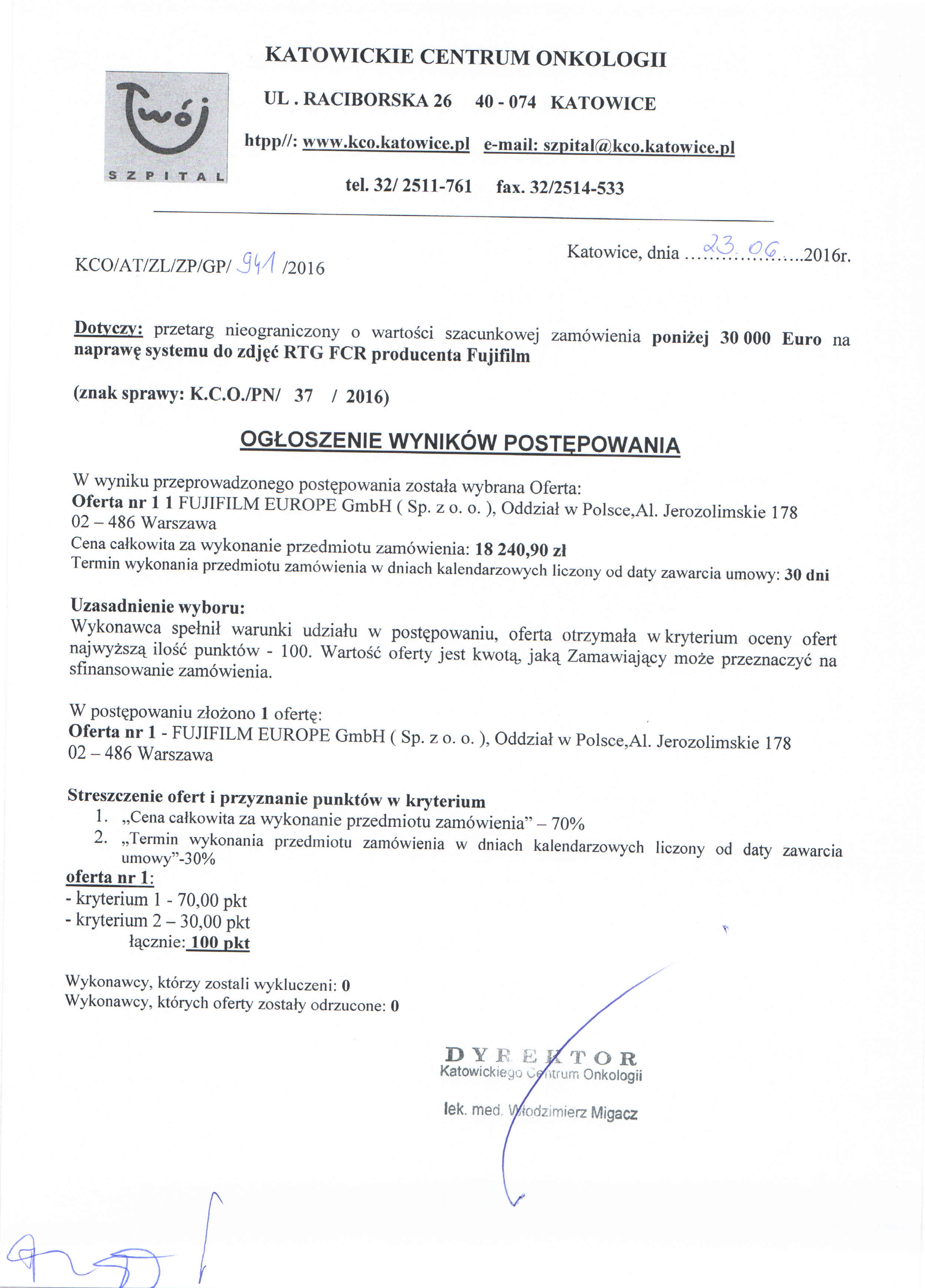w dniu 20.06.2016r. o godz. 11:30 w Katowickim Centrum Onkologii ul. Raciborska 28, budynek Przychodni, II piętro, Sekcja Zamówień Publicznych.