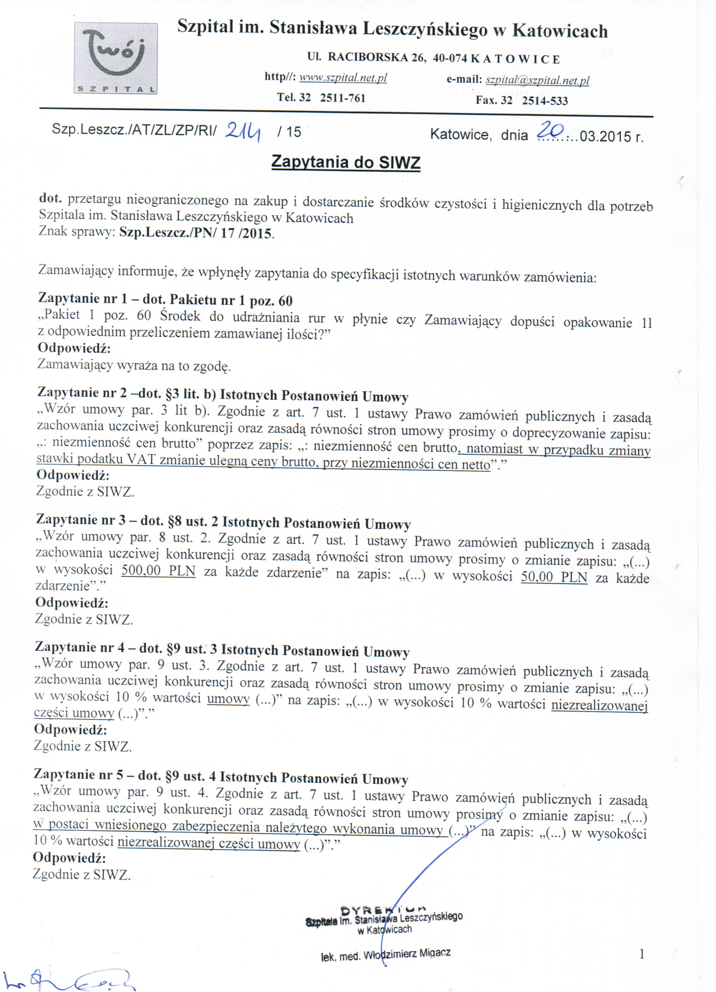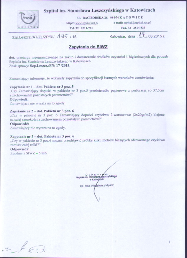 SIWZ można uzyskać pod adresem: Szpital im. Stanisława Leszczyńskiego w Katowicach, 40-074 Katowice, ul. Raciborska 26 – Dział Księgowości.