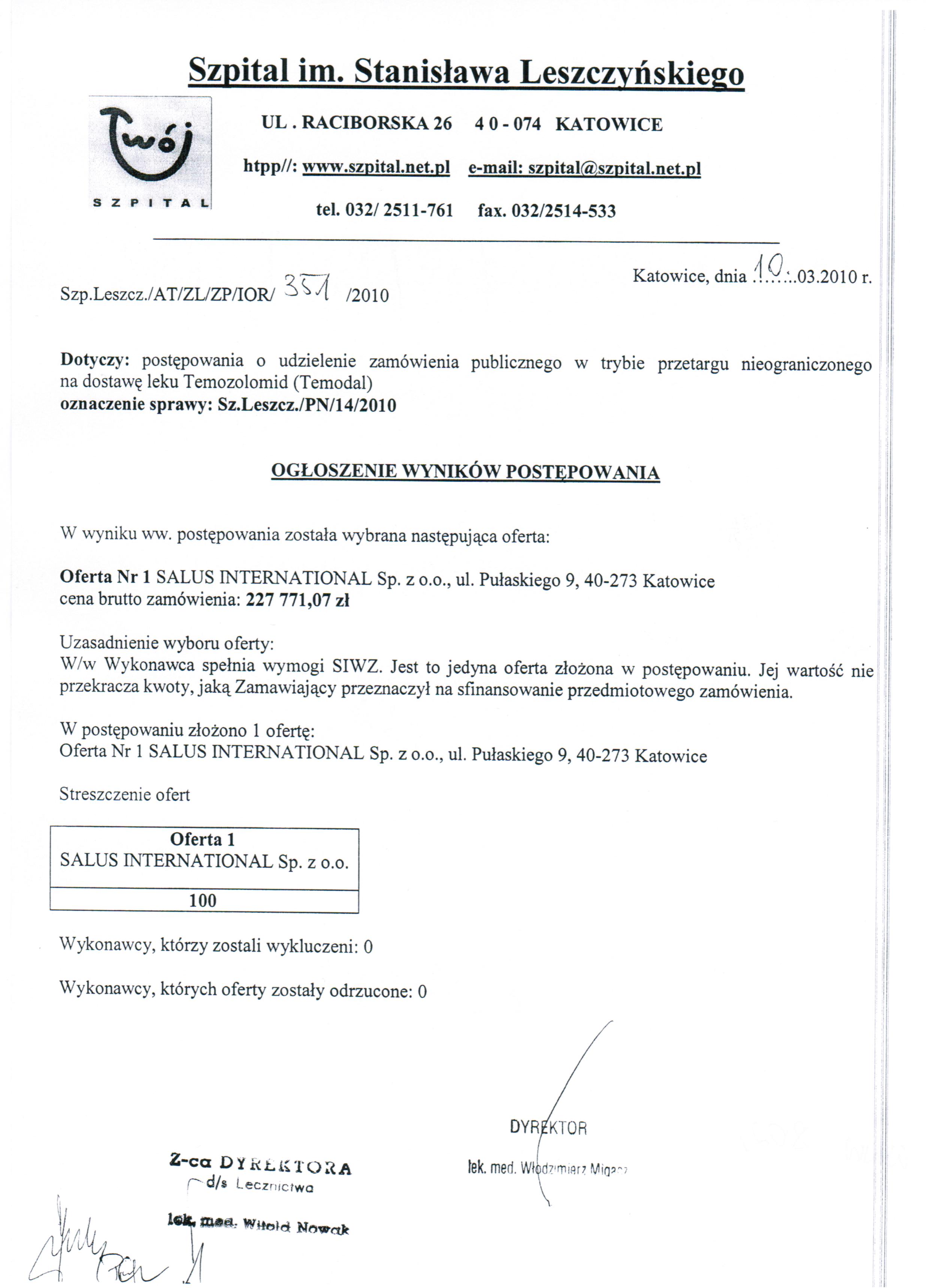 do dnia 05.03.2010r. do godz. 10:00 w Kancelarii Dyrektora Szpitala w Katowicach przy ul. Raciborskiej 26.