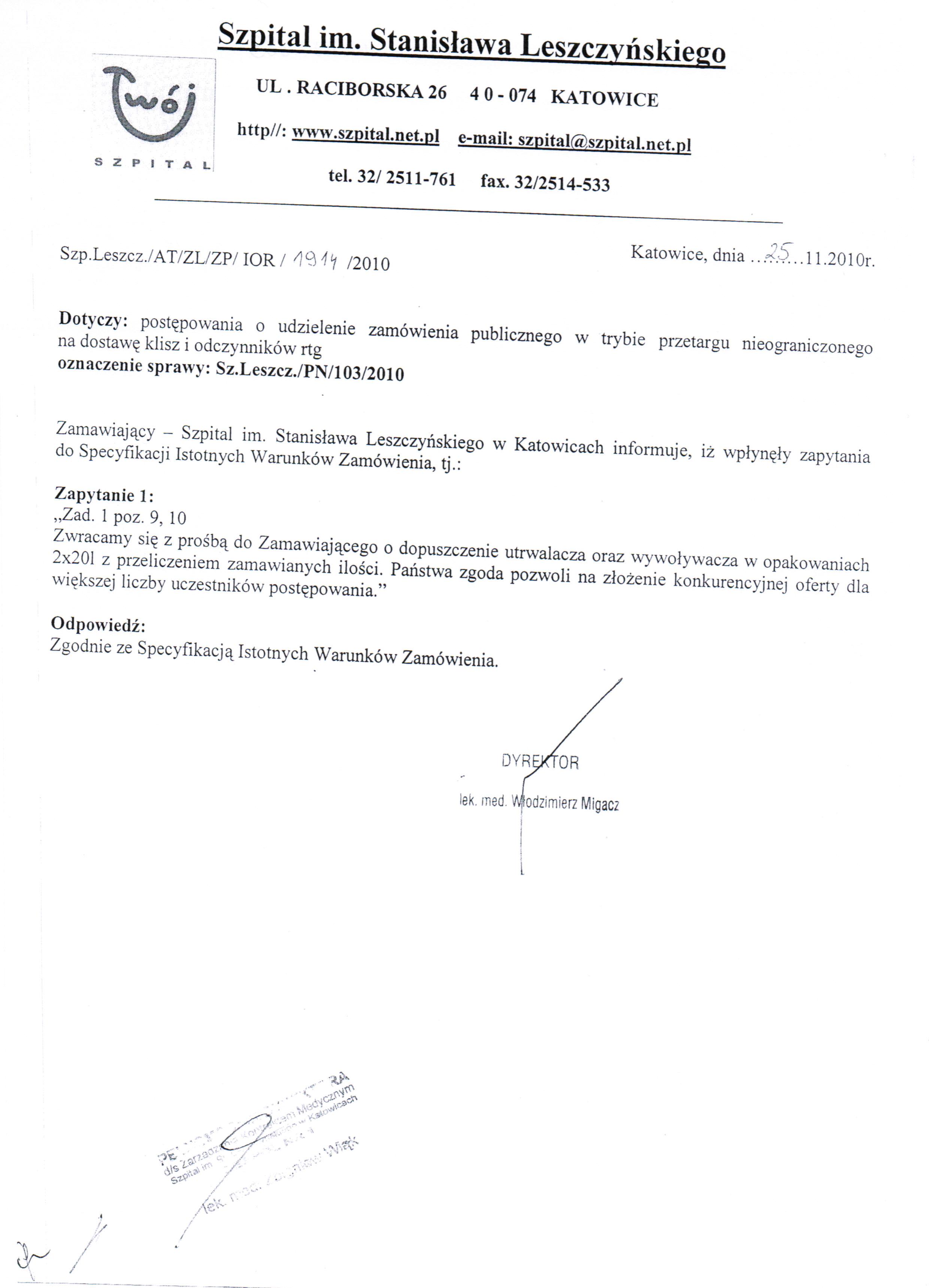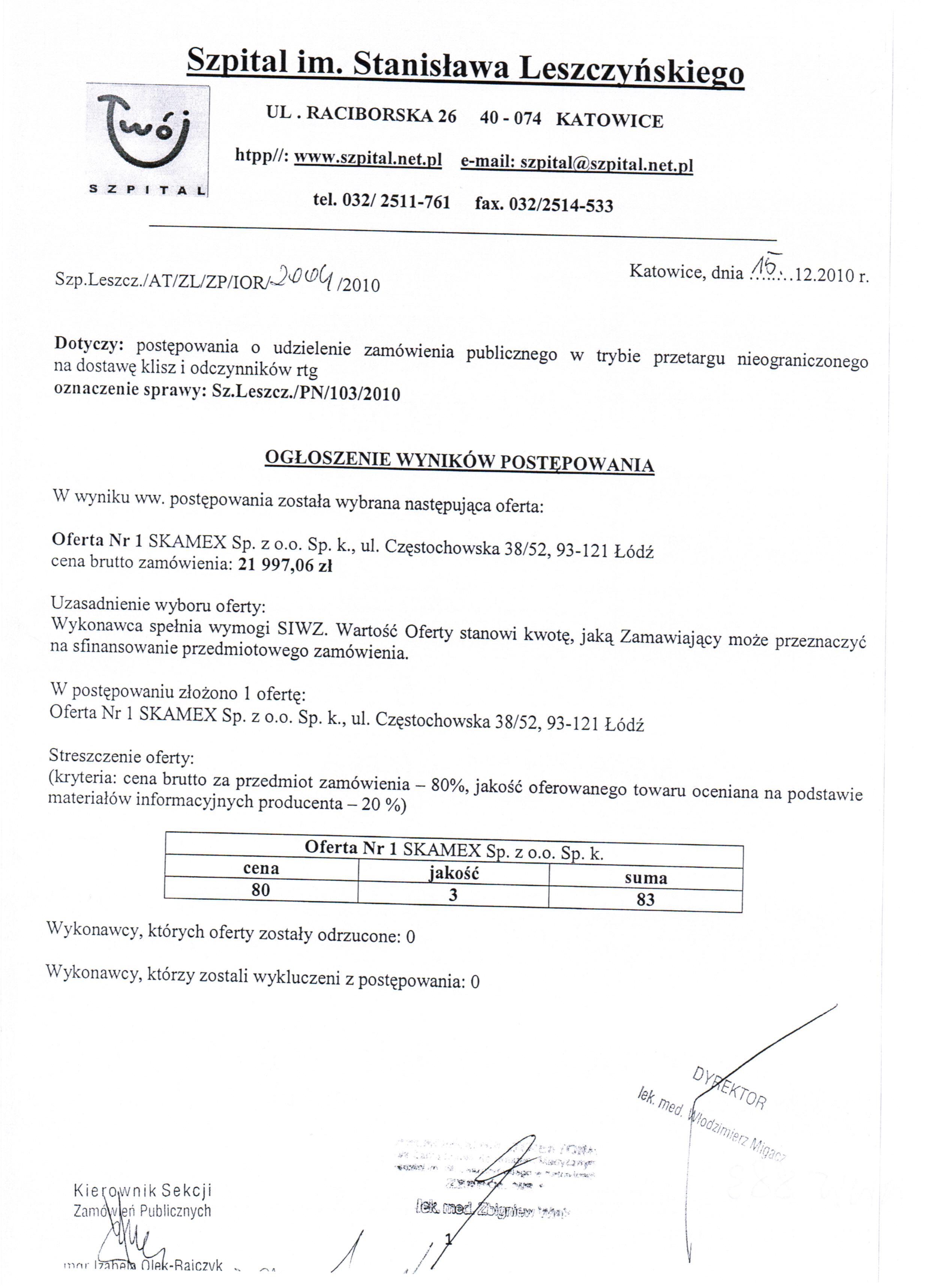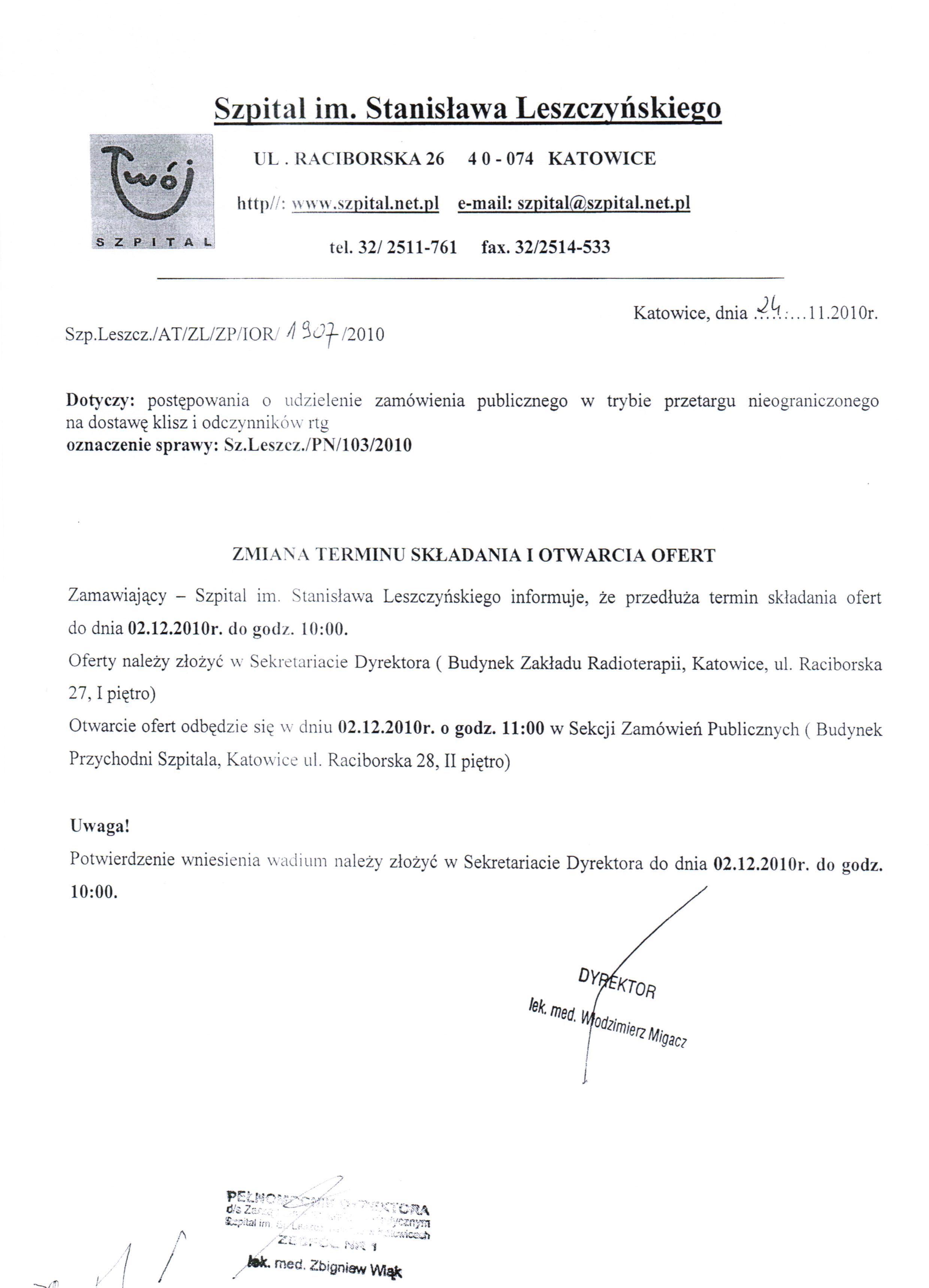 Oferty należy złożyć do dnia 26.11.2010r. do godz. 10:00 w 40-074 Katowice, ulica Raciborska 27, budynek Zakładu Radioterapii, I piętro, Sekretariat Dyrektora