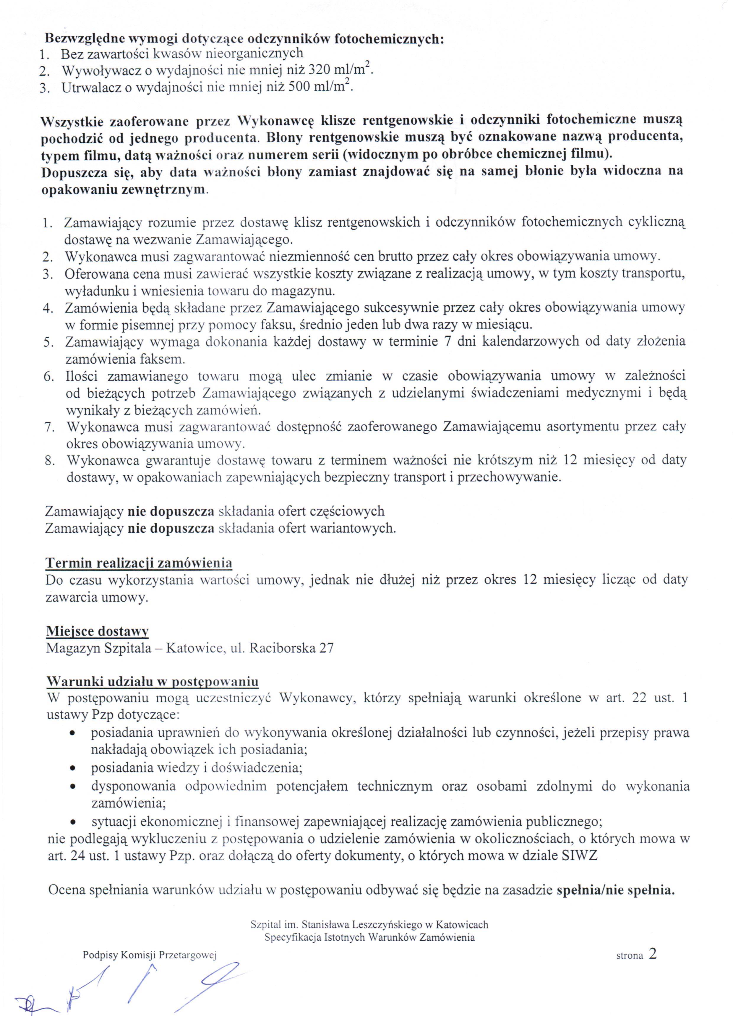 Wszystkie zaoferowane przez Wykonawcę klisze rentgenowskie i odczynniki fotochemiczne muszą pochodzić od jednego producenta. Błony rentgenowskie muszą być oznakowane nazwą producenta, typem filmu, datą ważności oraz numerem serii (widocznym po obróbce chemicznej filmu).