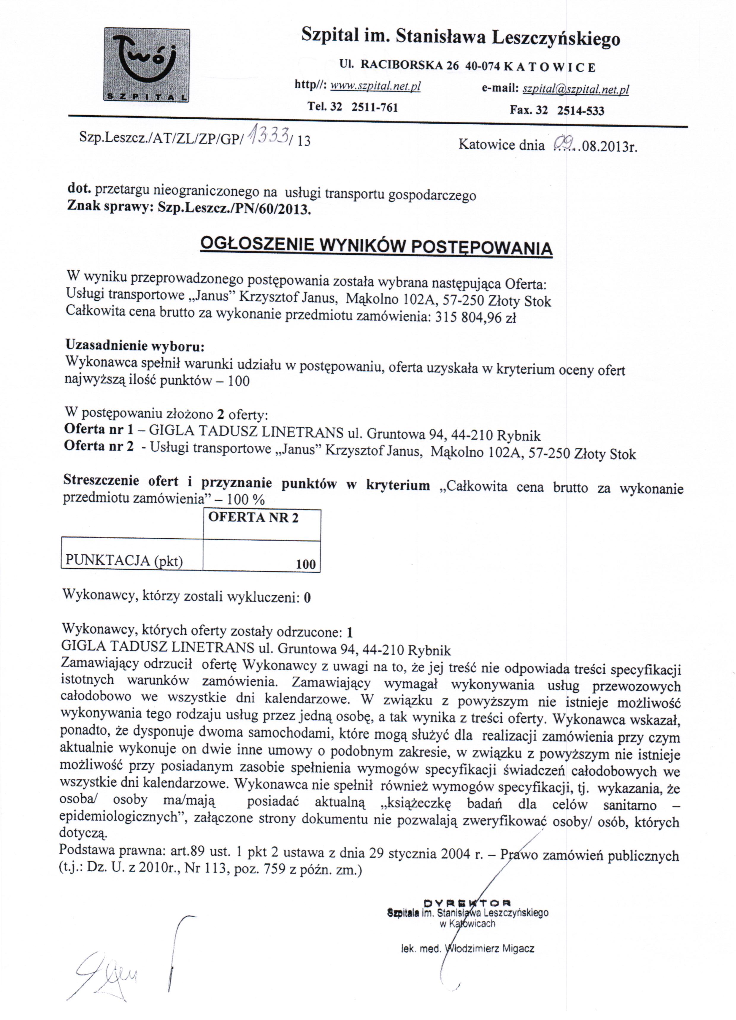 w dniu 22.07.2013 r. o godz. 11:00 w Szpitalu im. Stanisława Leszczyńskiego w Katowicach ul. Raciborska 28, budynek Przychodni, II piętro, Sekcja Zamówień Publicznych.