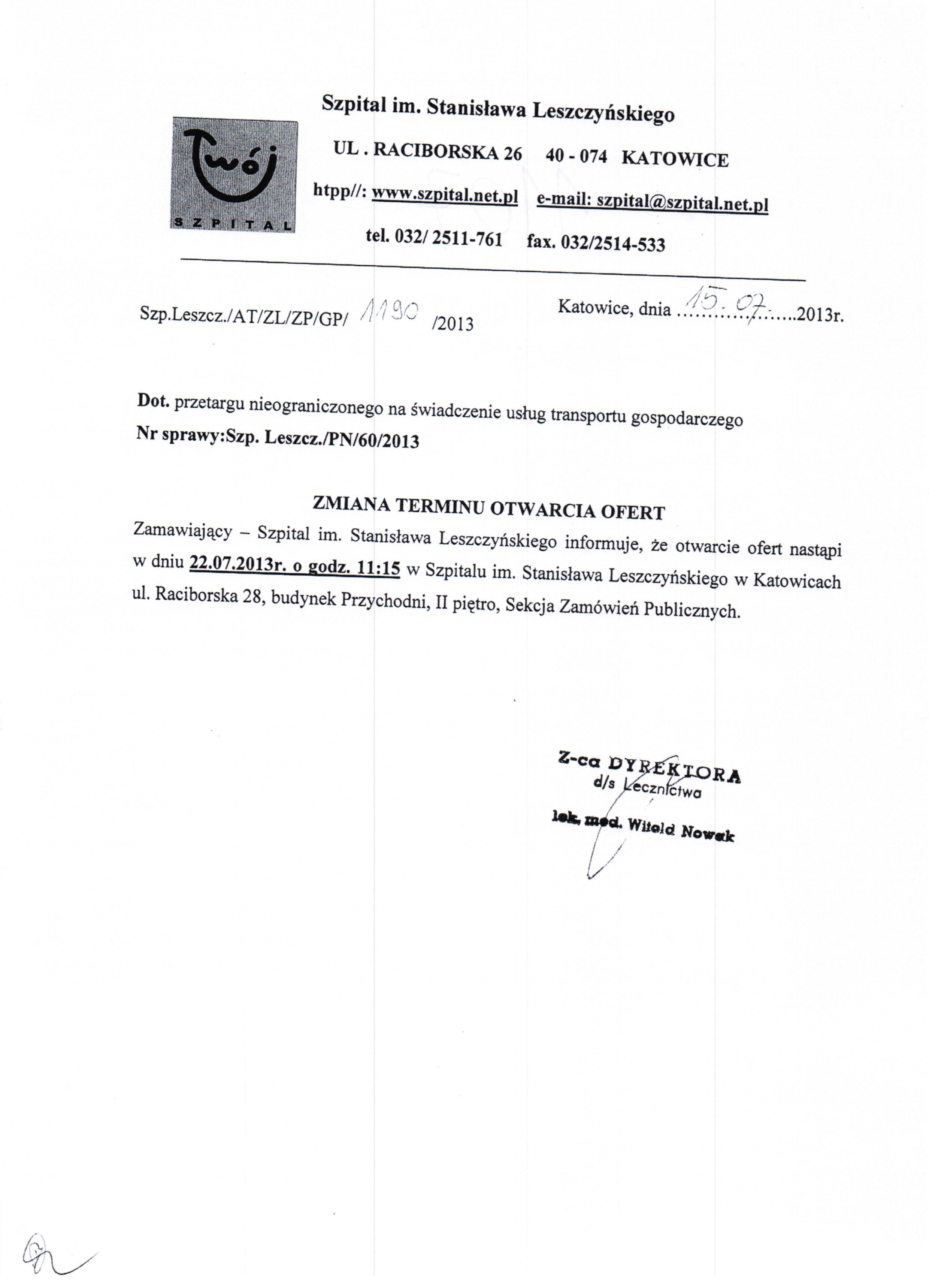 do dnia 22.07.2013 r. do godz. 10:00 w Szpitalu im. Stanisława Leszczyńskiego w Katowicach ul. Raciborska 26 – Kancelaria Dyrektora.