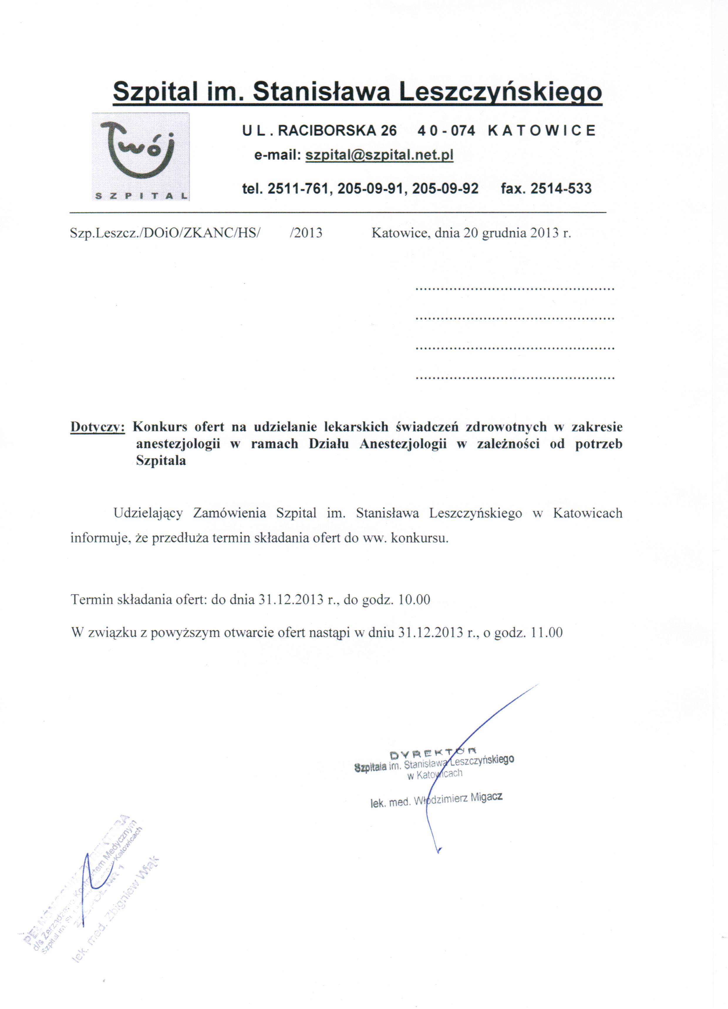 - Otwarcie ofert nastąpi w budynku Dyrekcji Szpitala im. Stanisława Leszczyńskiego, Raciborska 26, I piętro, Sala Konferencyjna w dniu 20.12.2013 o godz. 11.00