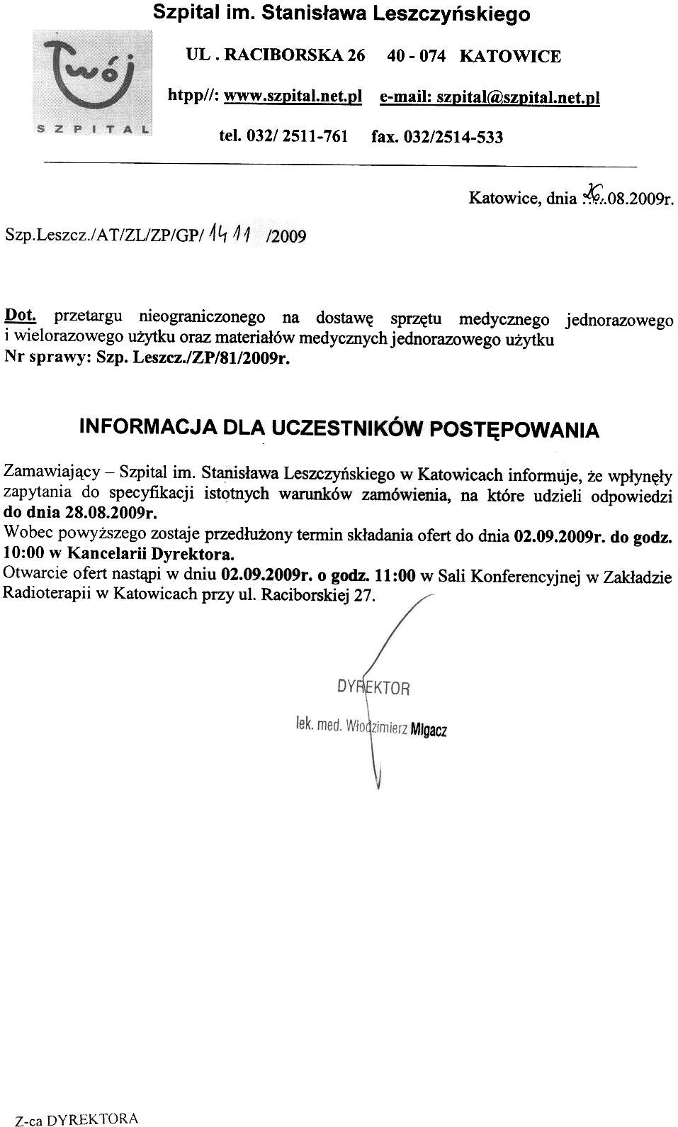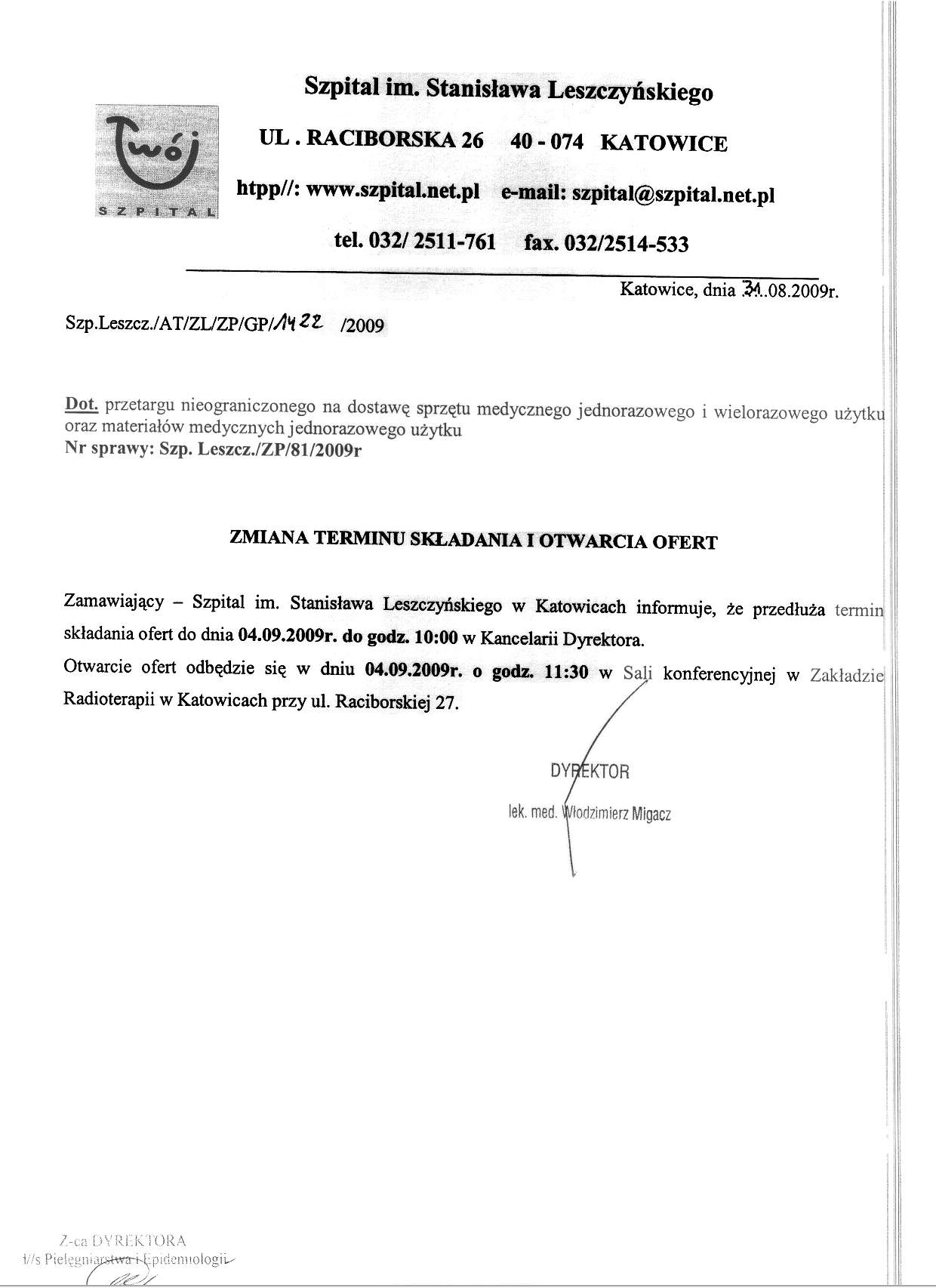 do dnia 31.08.2009r. do godz. 10:00 w Kancelarii Dyrektora Szpitala im. Stanisława Leszczyńskiego w Katowicach przy ul. Raciborskiej 26.